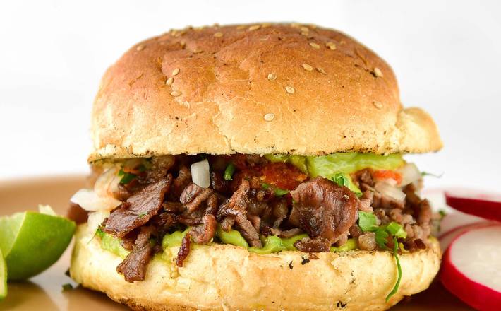 Hamburguesa personal:Cemita botanera con carne asada jugosa y bien sazonada, acompañado cebolla, cilantro, guacamole y limones.