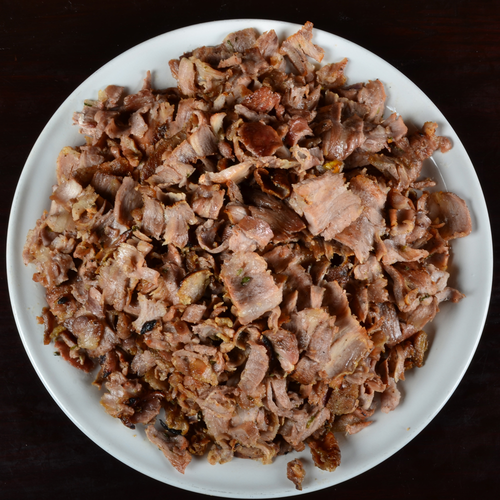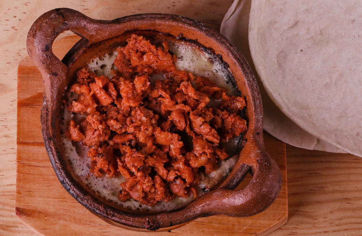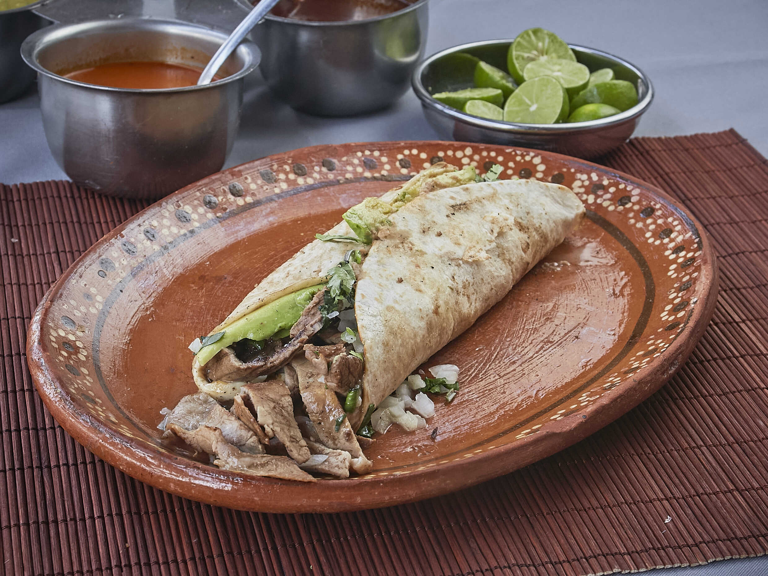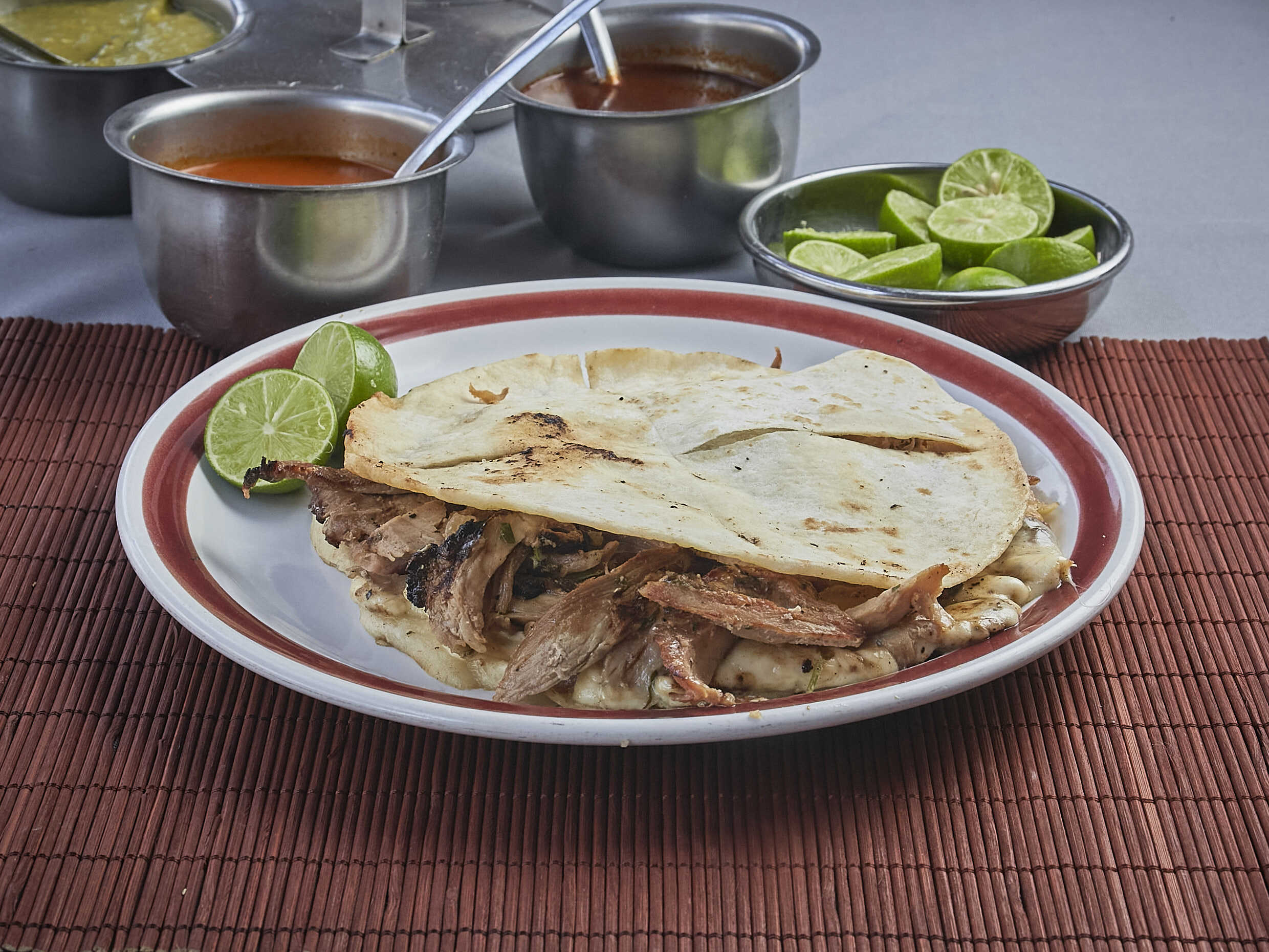 Queso, Frijoles refritos, aguacate, carne arabe,cebolla y cilantro (salsa y limones aparte)