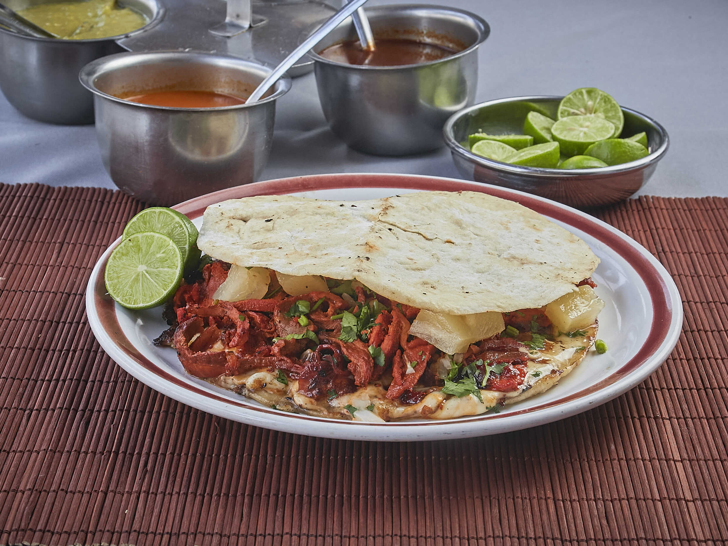 Tortilla de harina, queso, carne árabe y piña (salsa y limones aparte)