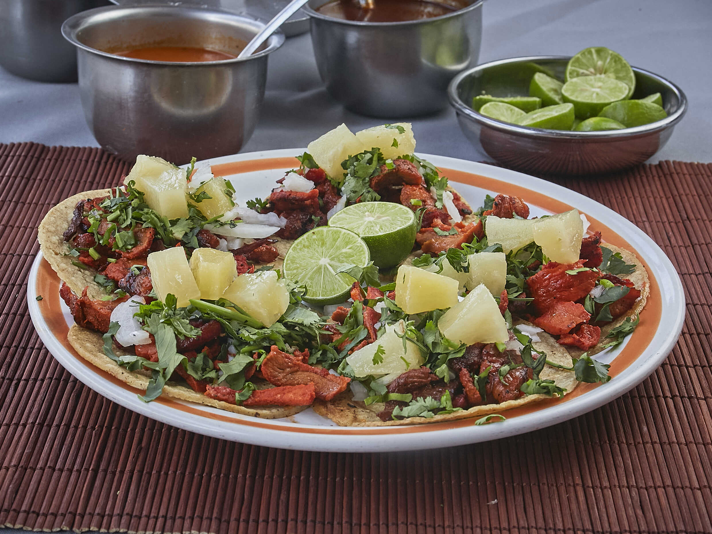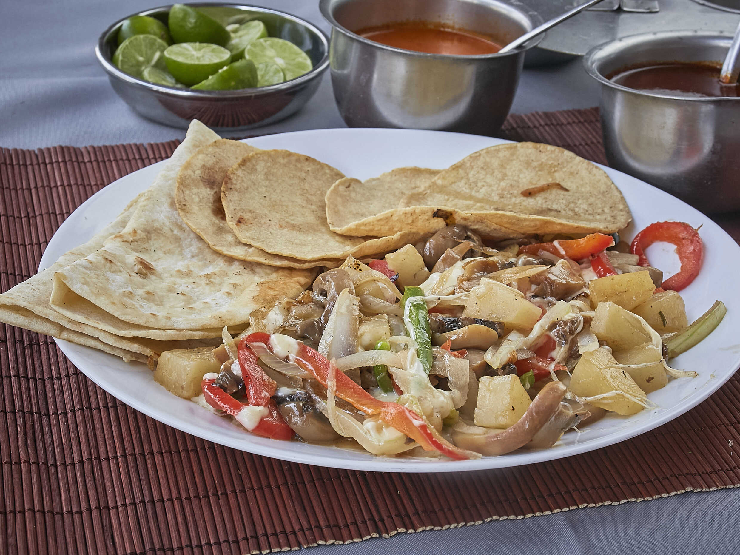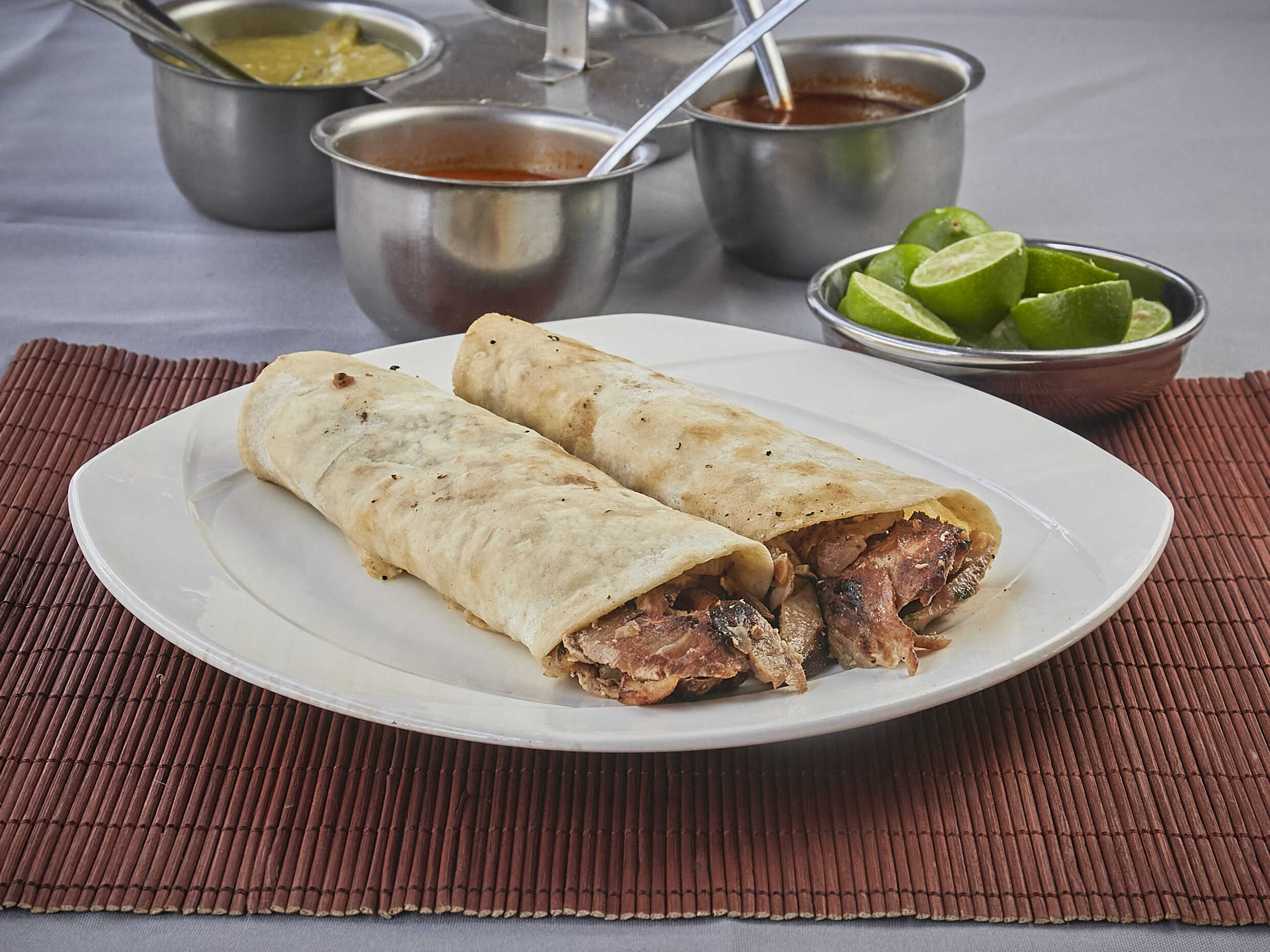 Incluye 10 tortillas de harina o maíz, salsas (roja, verde, árabe con chipotle y habanero), rábanos y limones.