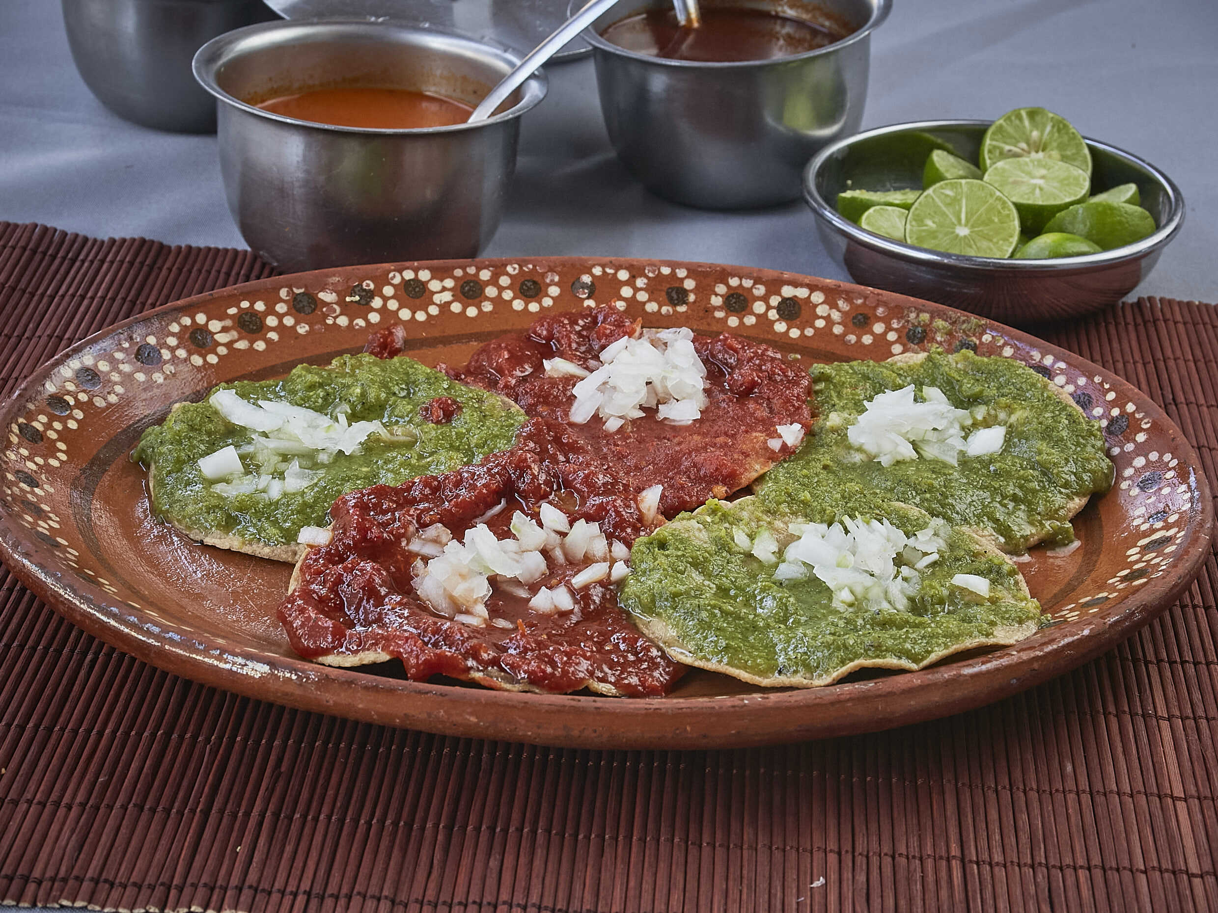 Incluye 20 tortillas de harina o maíz, salsa (roja, verde, árabe con chipotle y habanero), rábanos y limones.