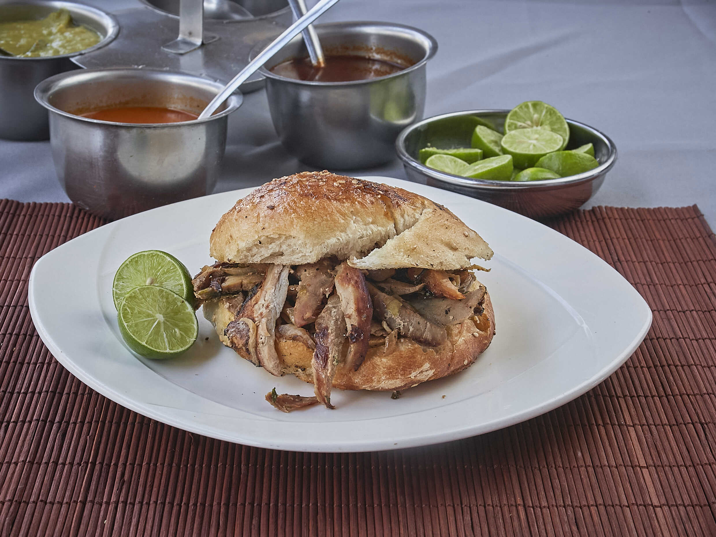 cemita con queso, carne árabe y piña (salsa y limones aparte)