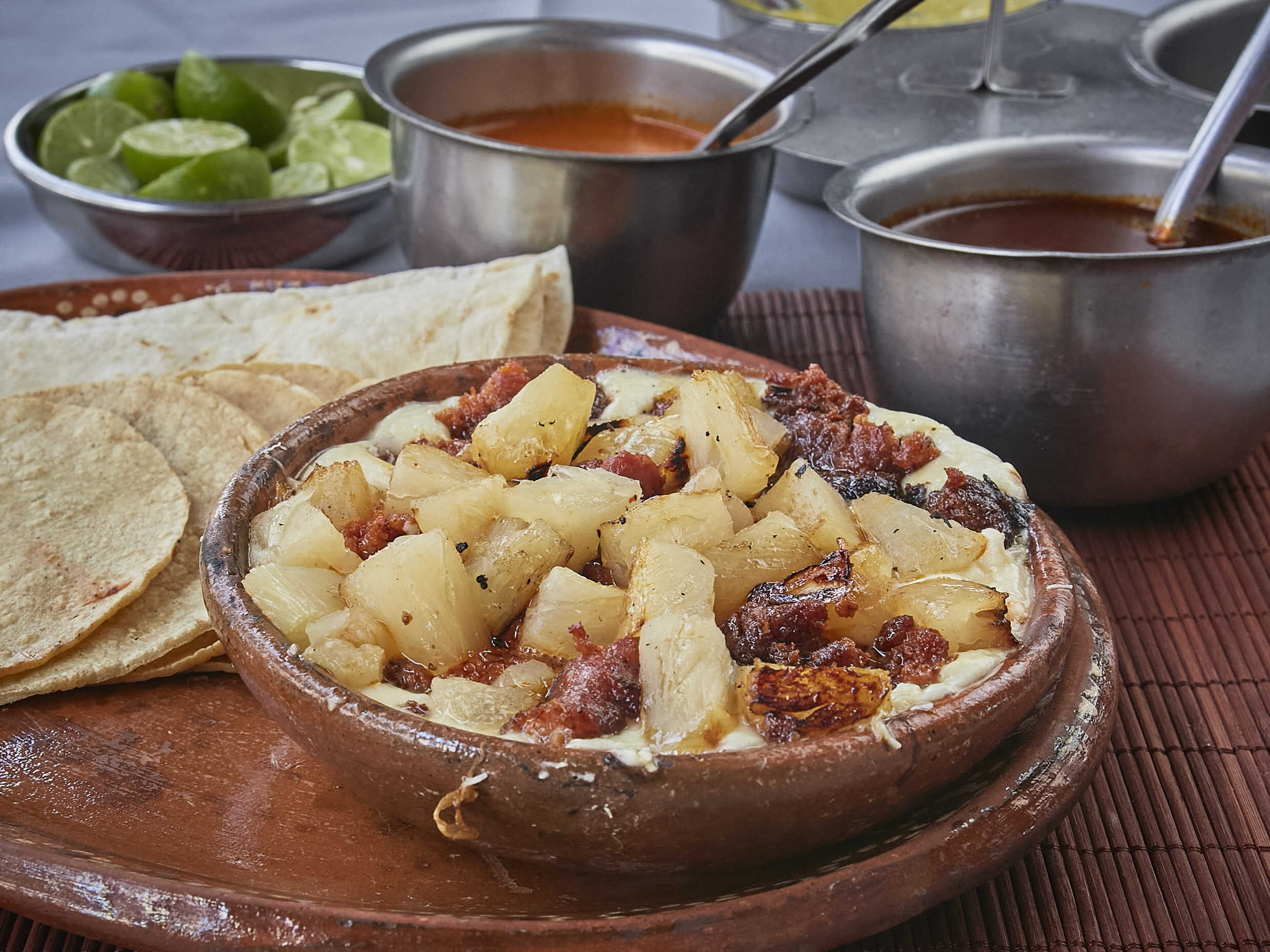 Queso, Frijoles refritos, aguacate,carne al pastor, cebolla y cliantro (salsa y limones aparte)