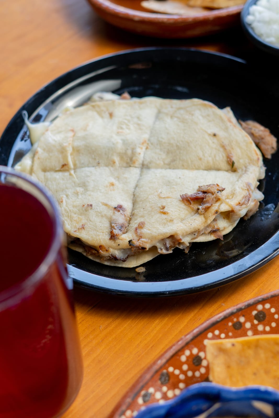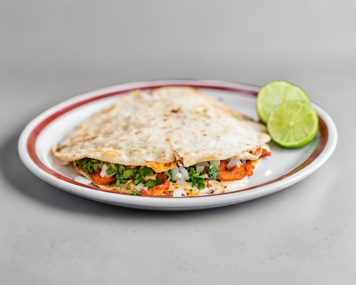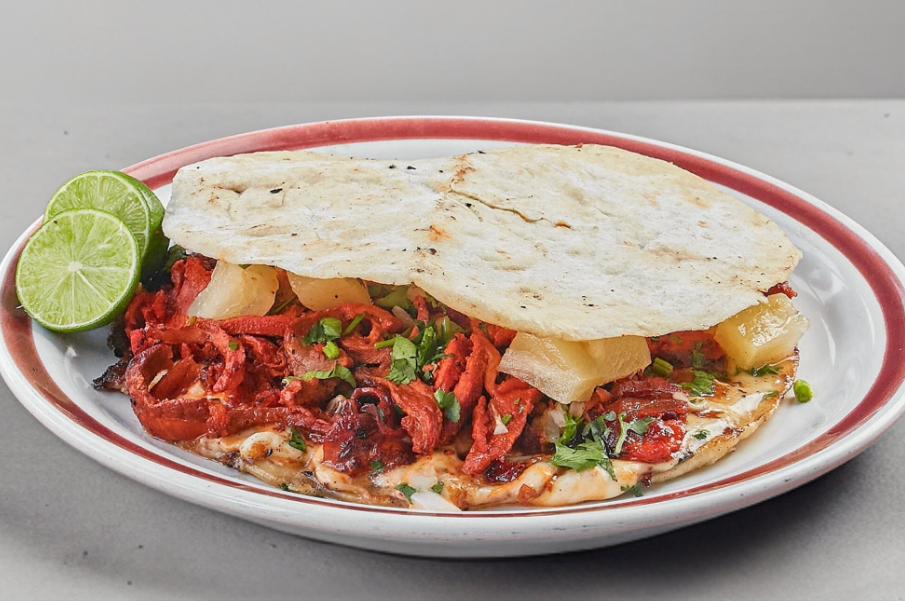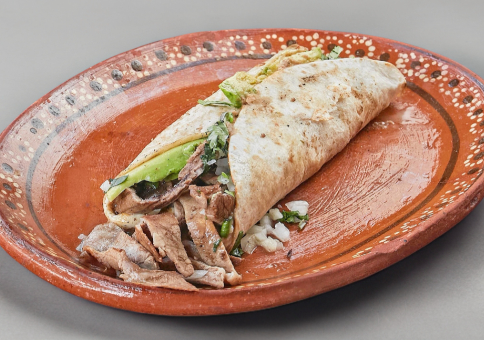 Tortilla de harina con queso fundido y carne cocida al carbón y chorizo.