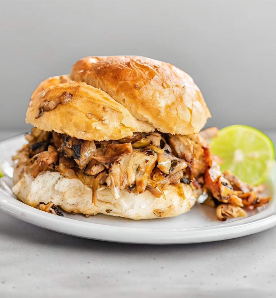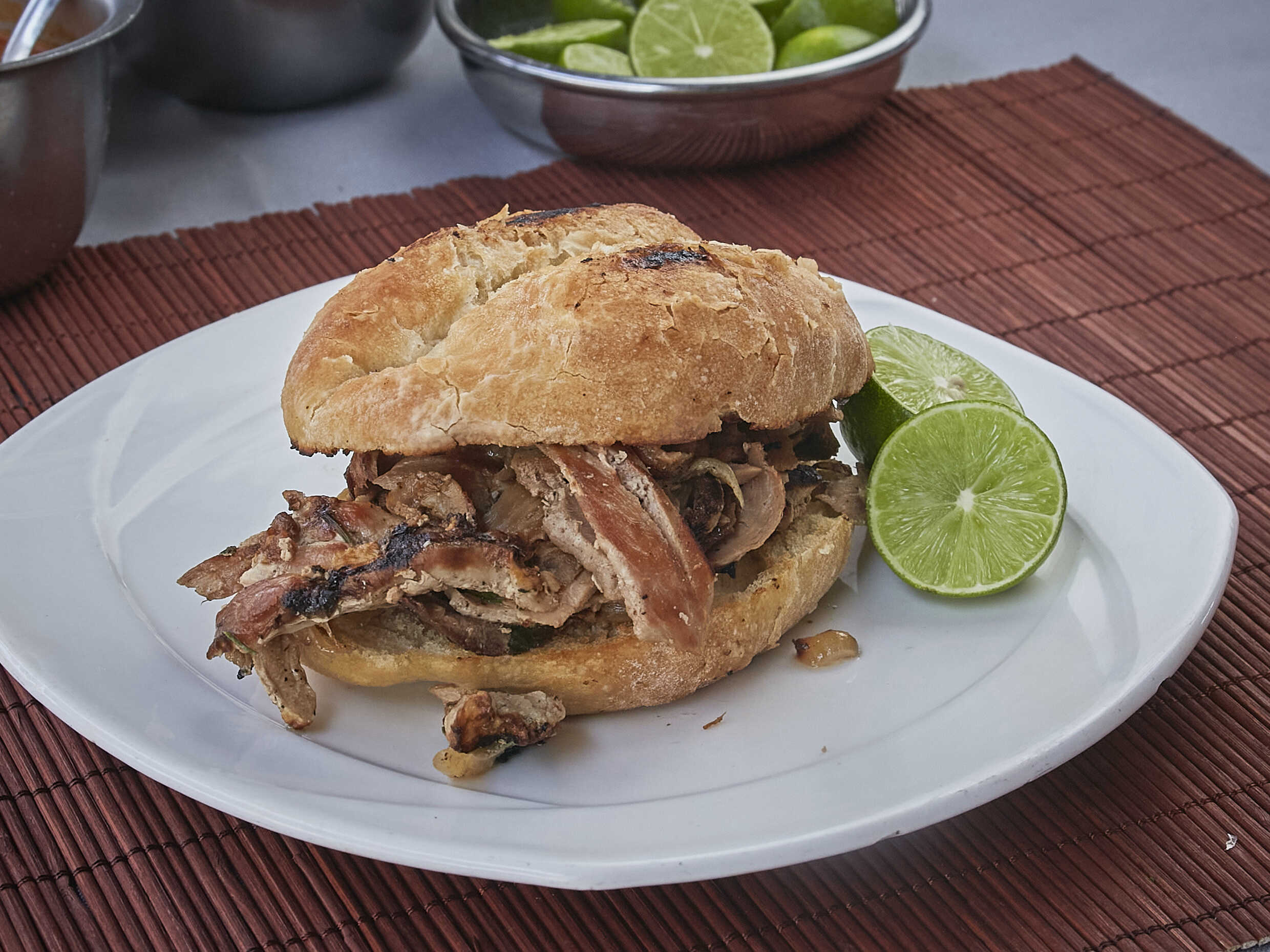Tortilla de harina con queso fundido, carne árabe cocida al carbón y piña.