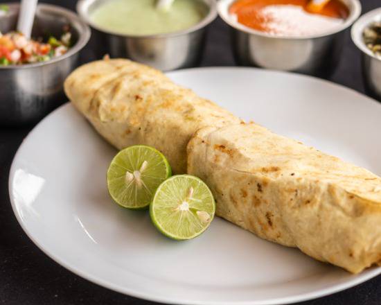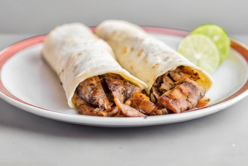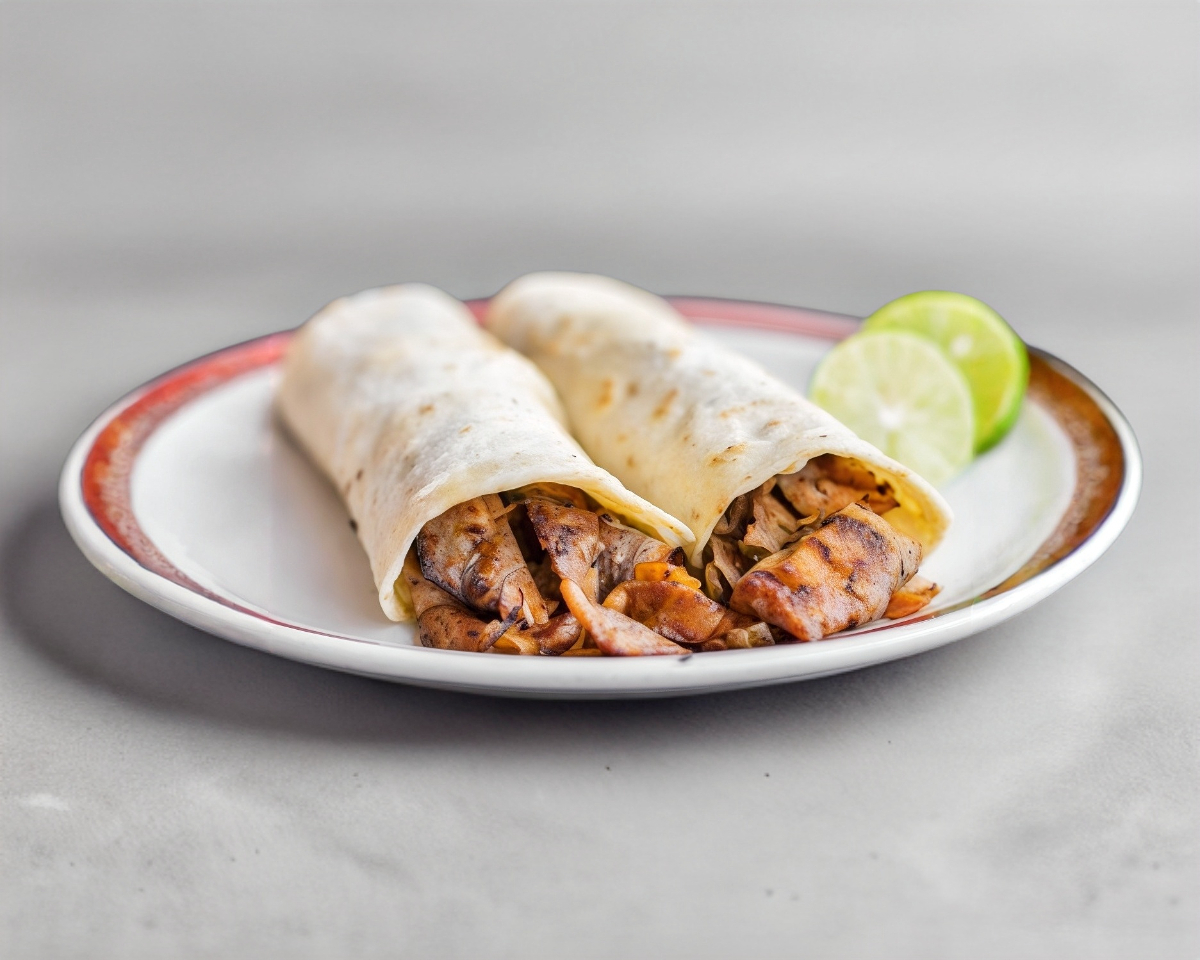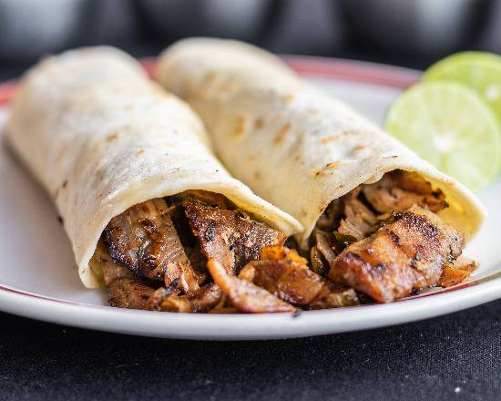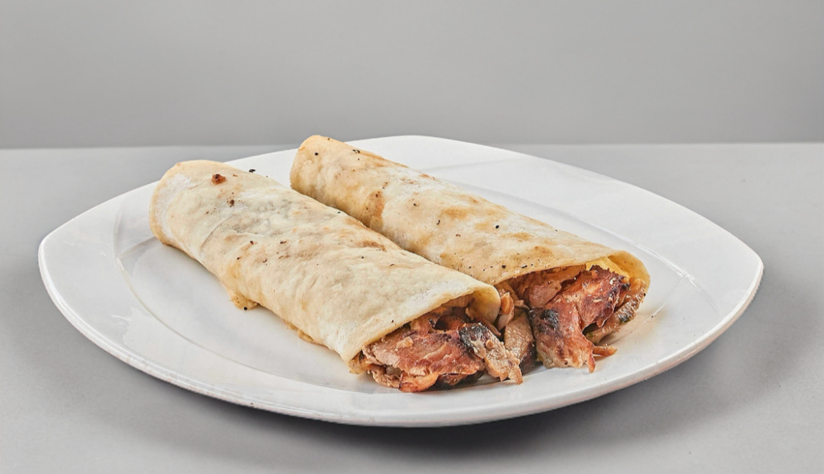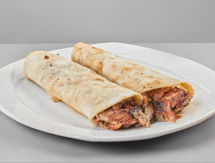 Tortilla de harina con queso fundido y carne árabe al carbón.