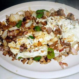 Chile jalapeño, cebolla, bistec, tocino, longaniza y queso.
