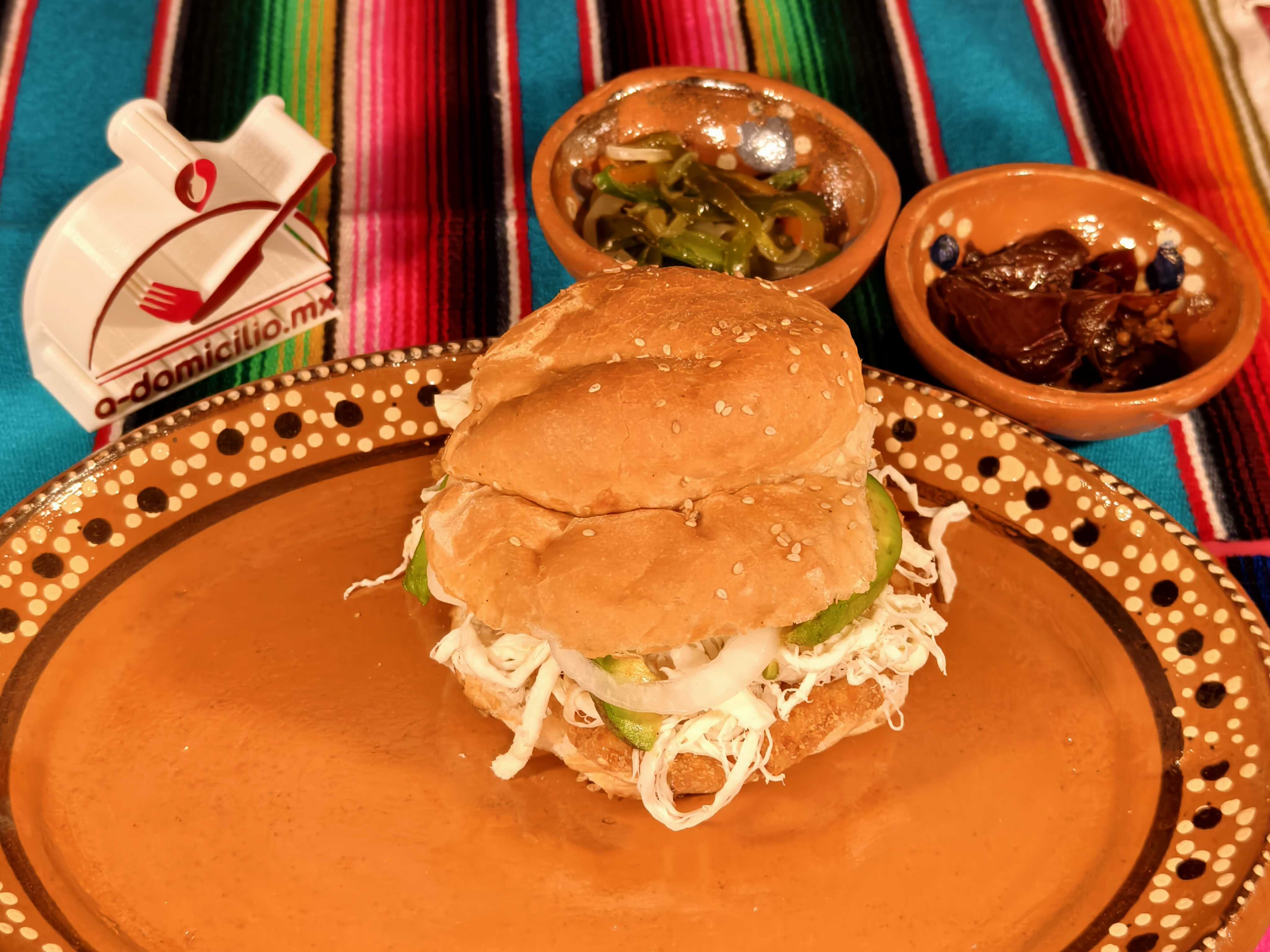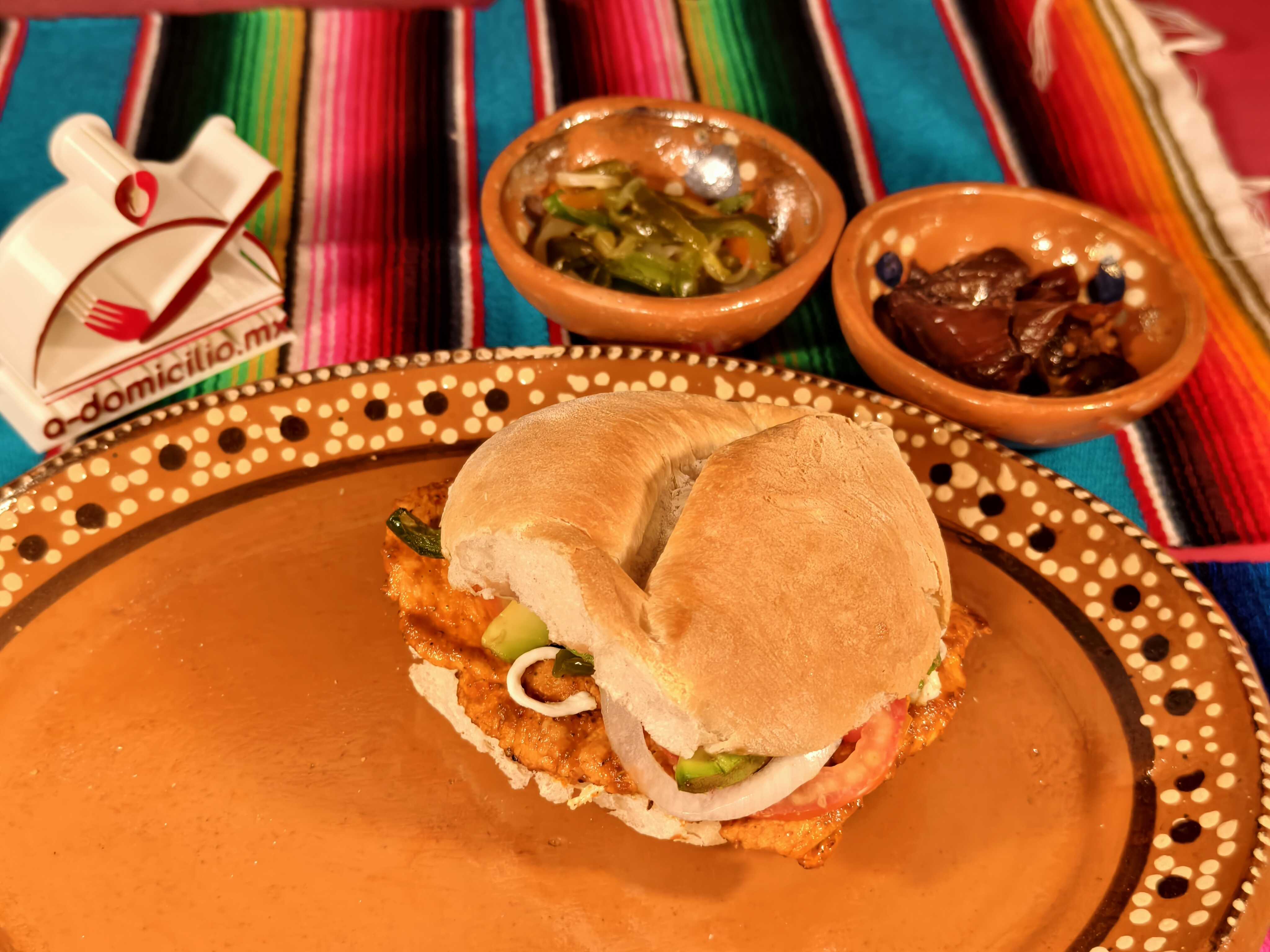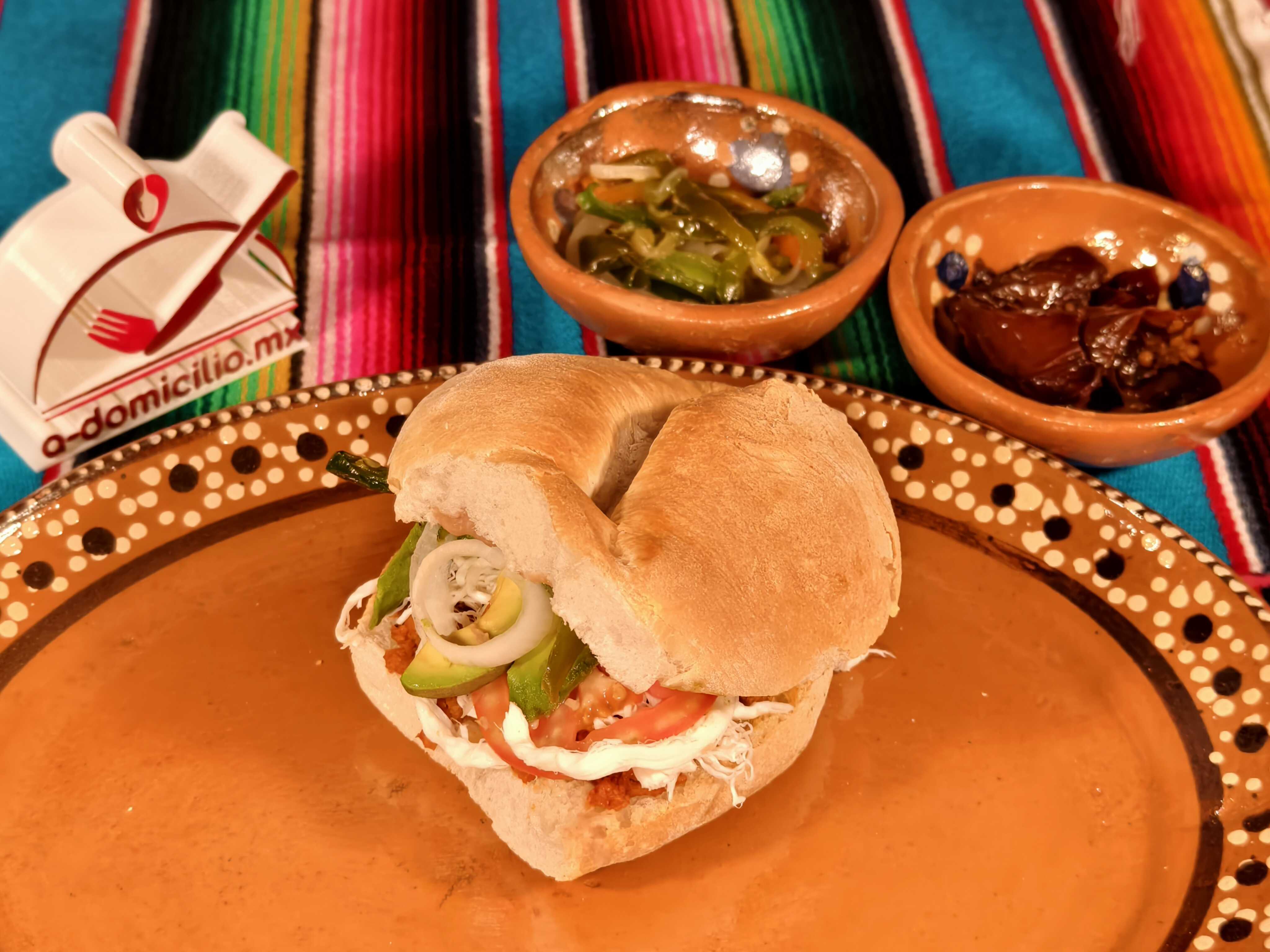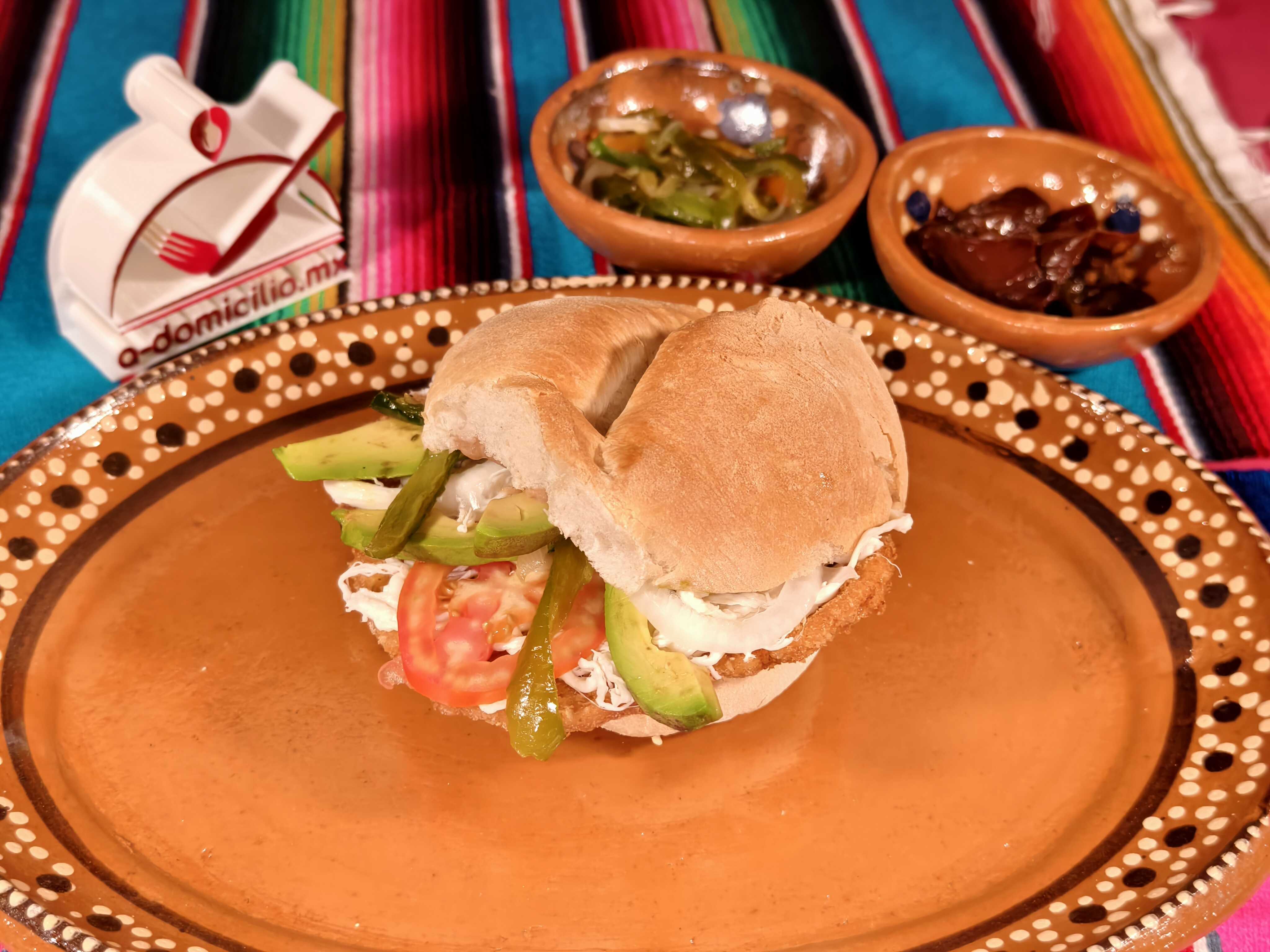 Torta de Milanesa de pollo, quesillo, mayonesa, frijoles, lechuga, jitomate, aguacate y cebolla.