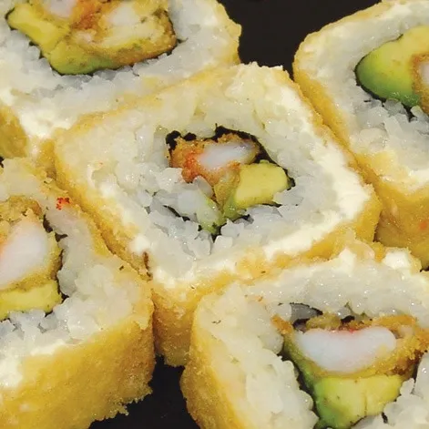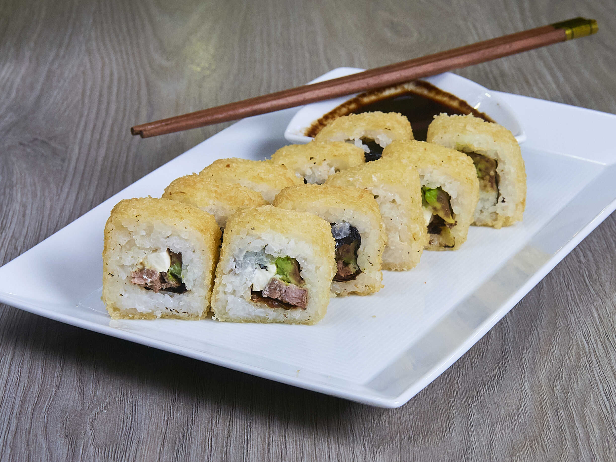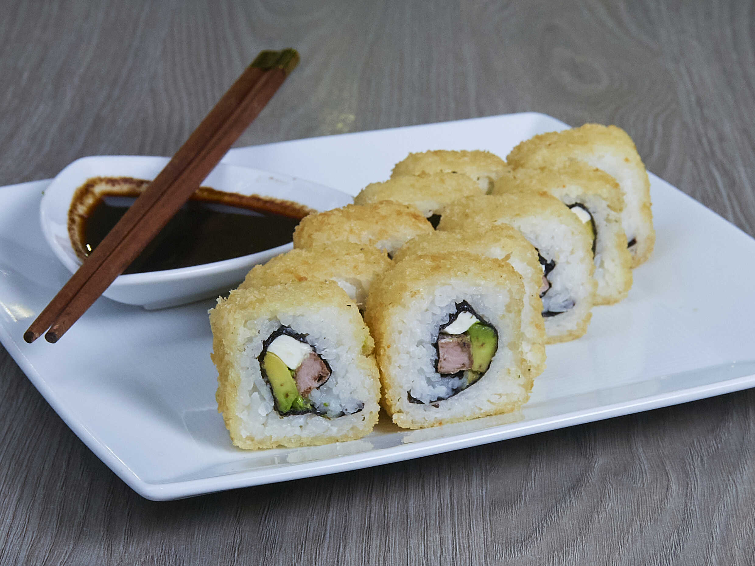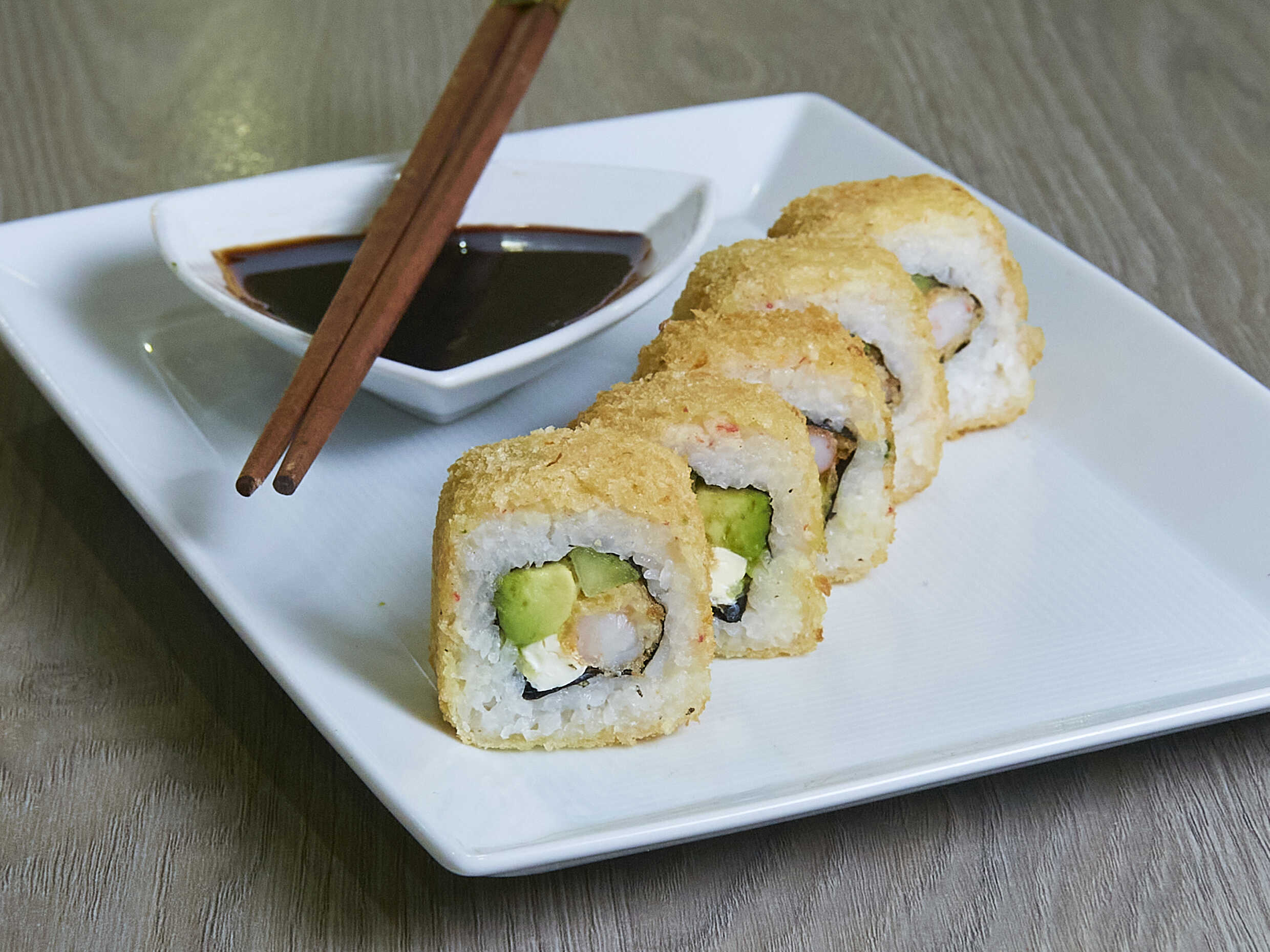 Rollo empanizado por fuera, con camarón, pepino, shiitake (hongo japonés) y philadelphia por dentro. Plátano macho abajo de la capa del empanizado.