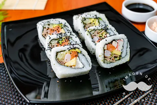 Un Philadelphia maki, medio maki de aguacate y mango y medio California masago.