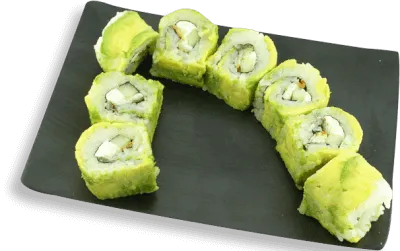 Rollo con pepino, aguacate, surimi y queso philadelphia por fuera.