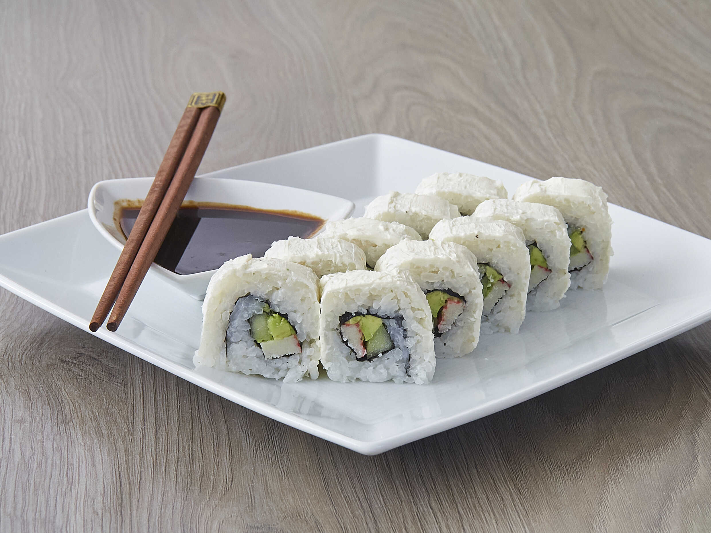 Aguacate y camarón empanizado por dentro. Queso philadelphia por fuera.
