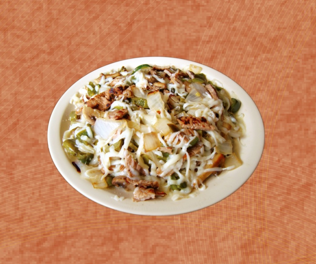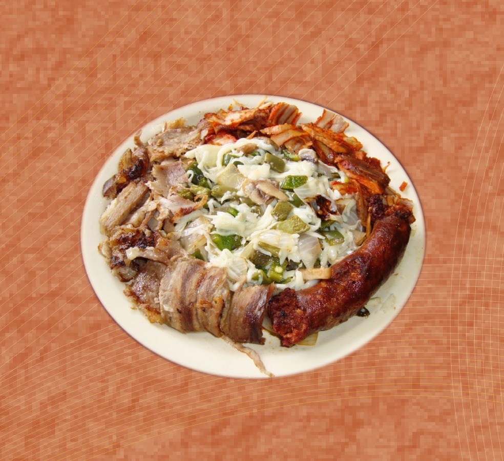 Carne árabe, carne al pastor, bistec, longaniza, nopalitos, cebollita, champiñones, pimiento morrón, queso y tortillas.