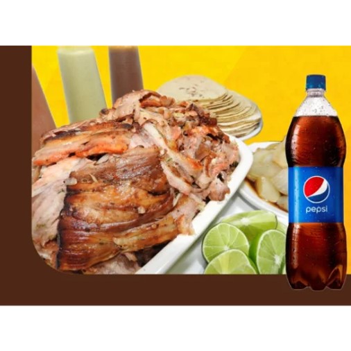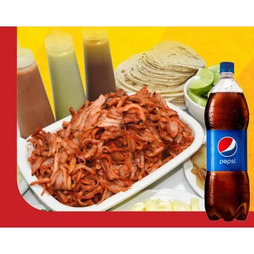 1 Kilo de carne al pastor, Pepsi de 2 litros, 10 tortillas de harina, 20 tortillas de maíz, piña, cilantro, cebolla, salsas y limones.