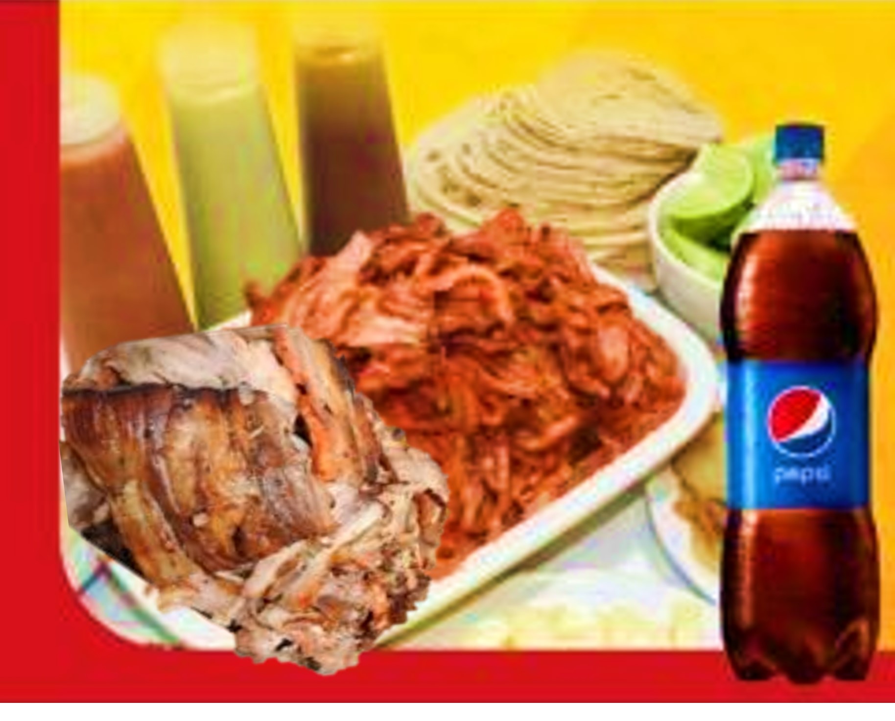 ¾ Kilo de carne al pastor, Pepsi de 1.5 litros, 8 tortillas de harina, 15 tortillas de maíz, piña, cilantro, cebolla, salsas y limones.