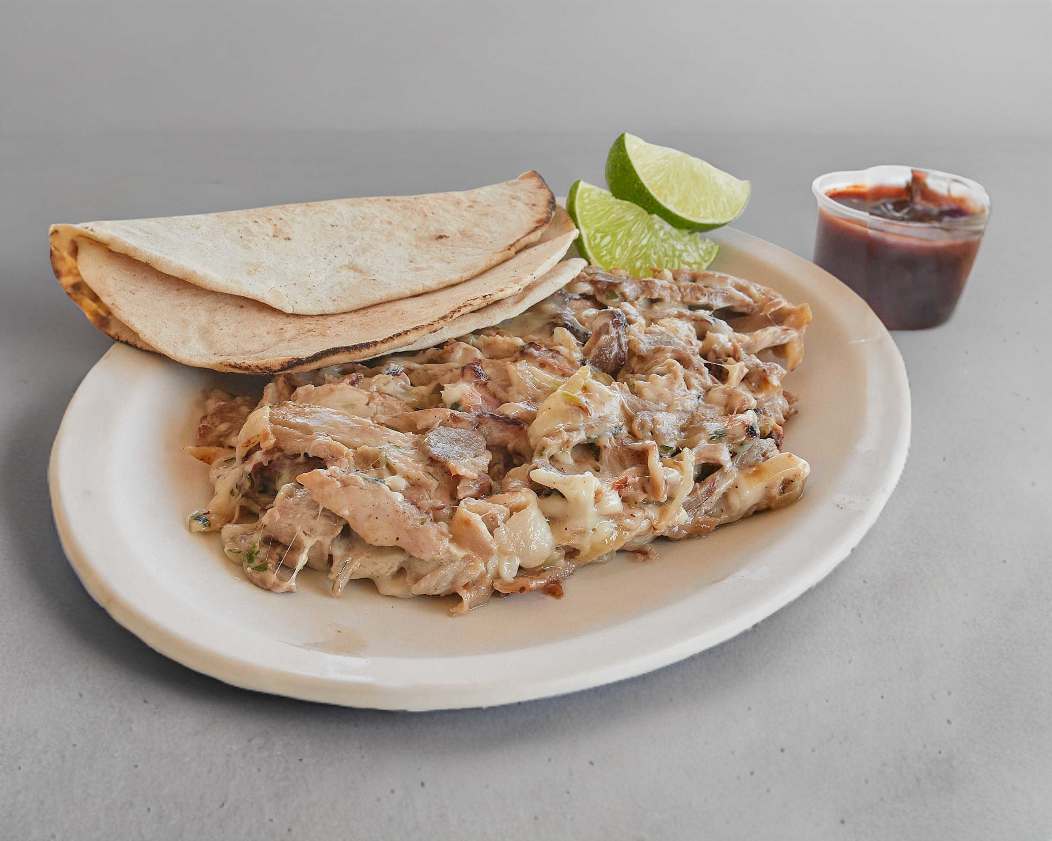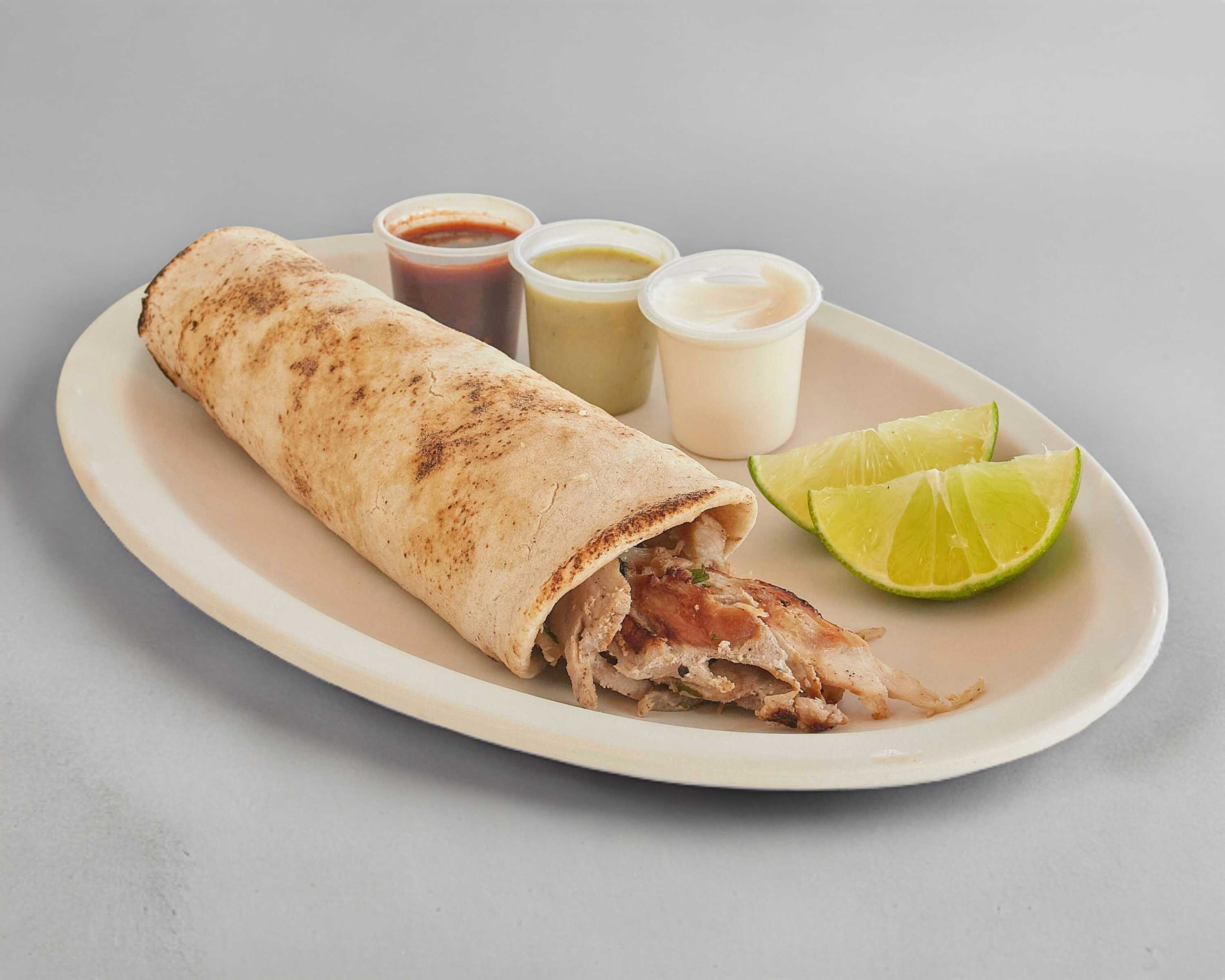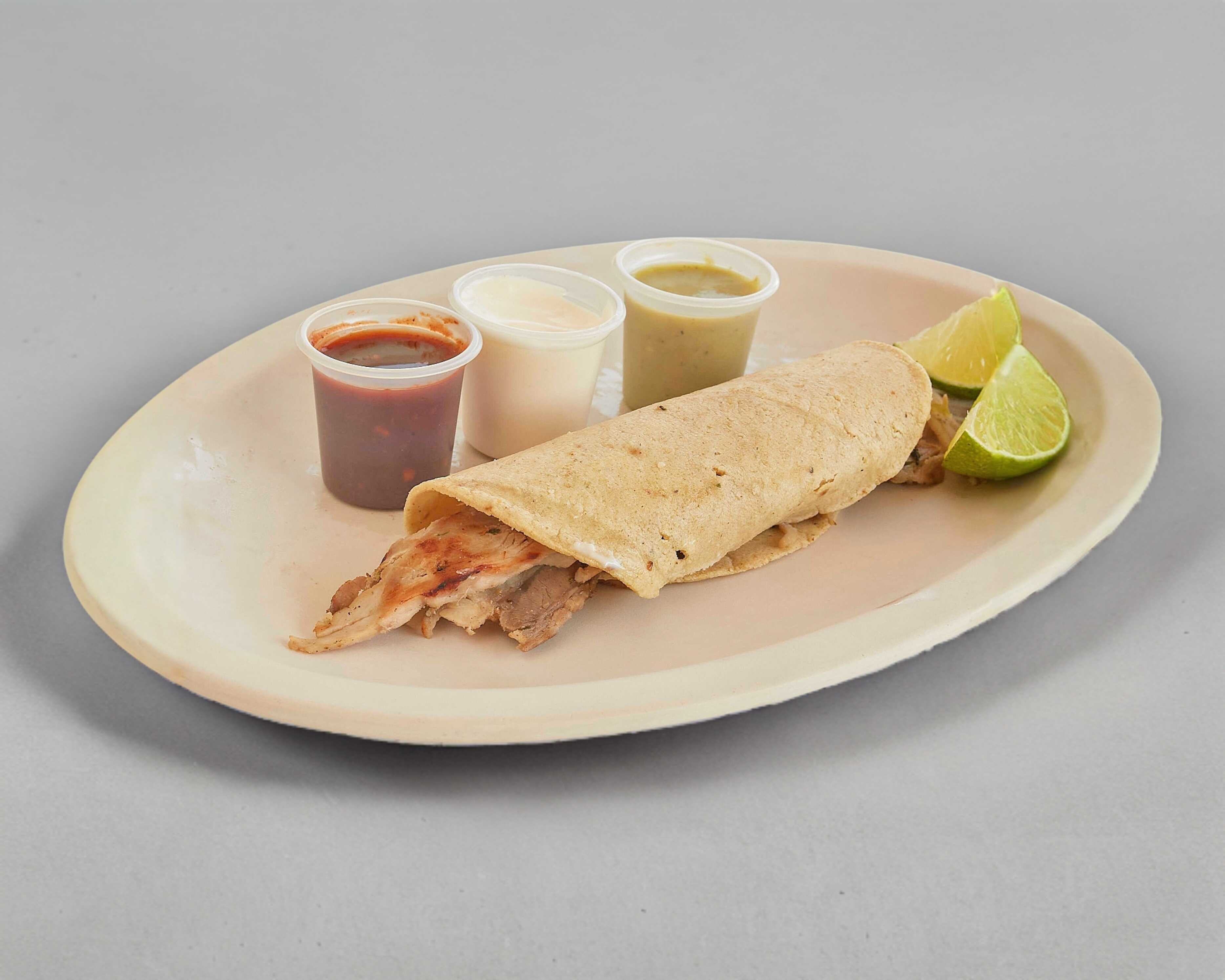 Tortilla de maíz con carne árabe. Incluye: salsa de chipotle, salsa de habanero, aderezo de ajo y limones