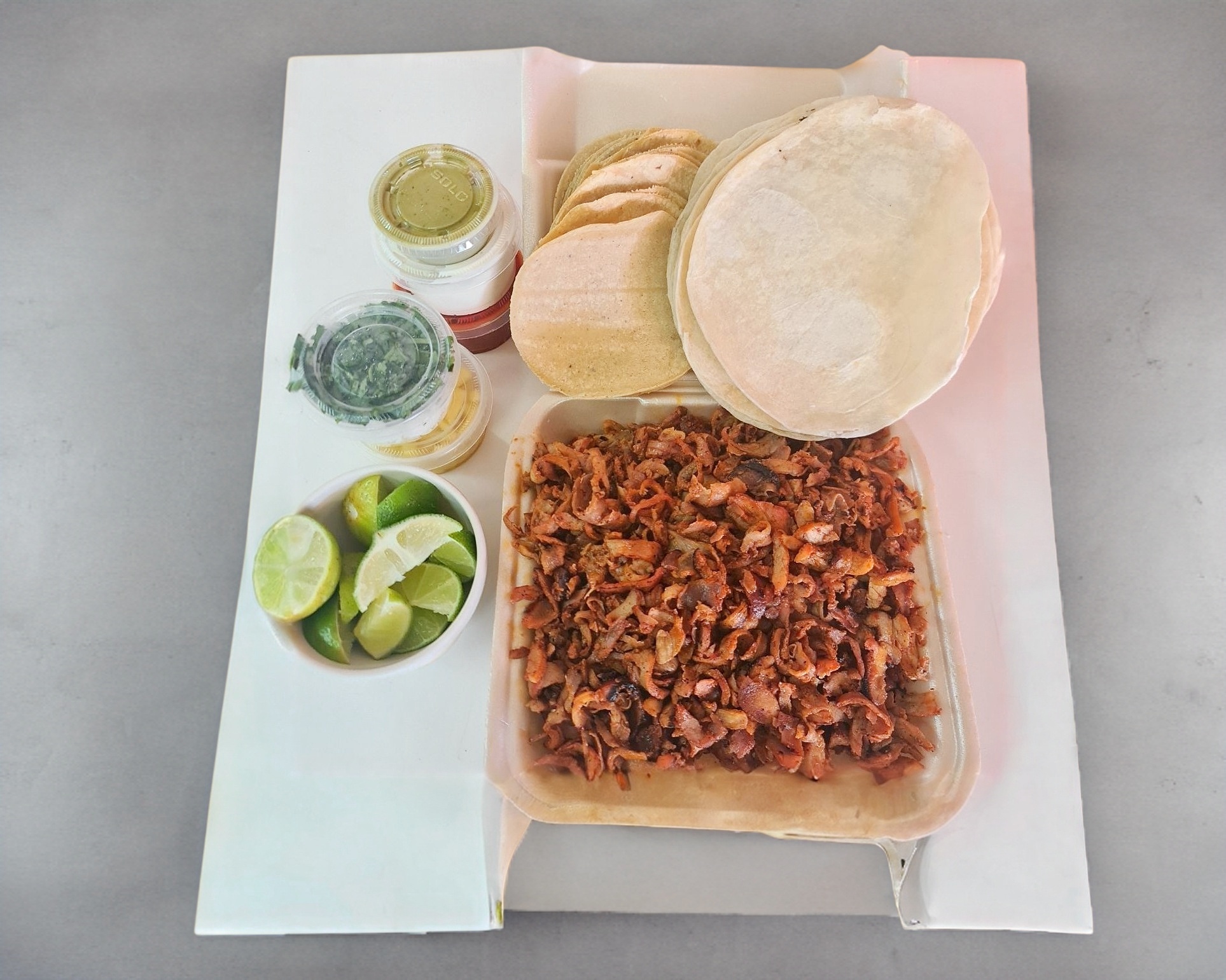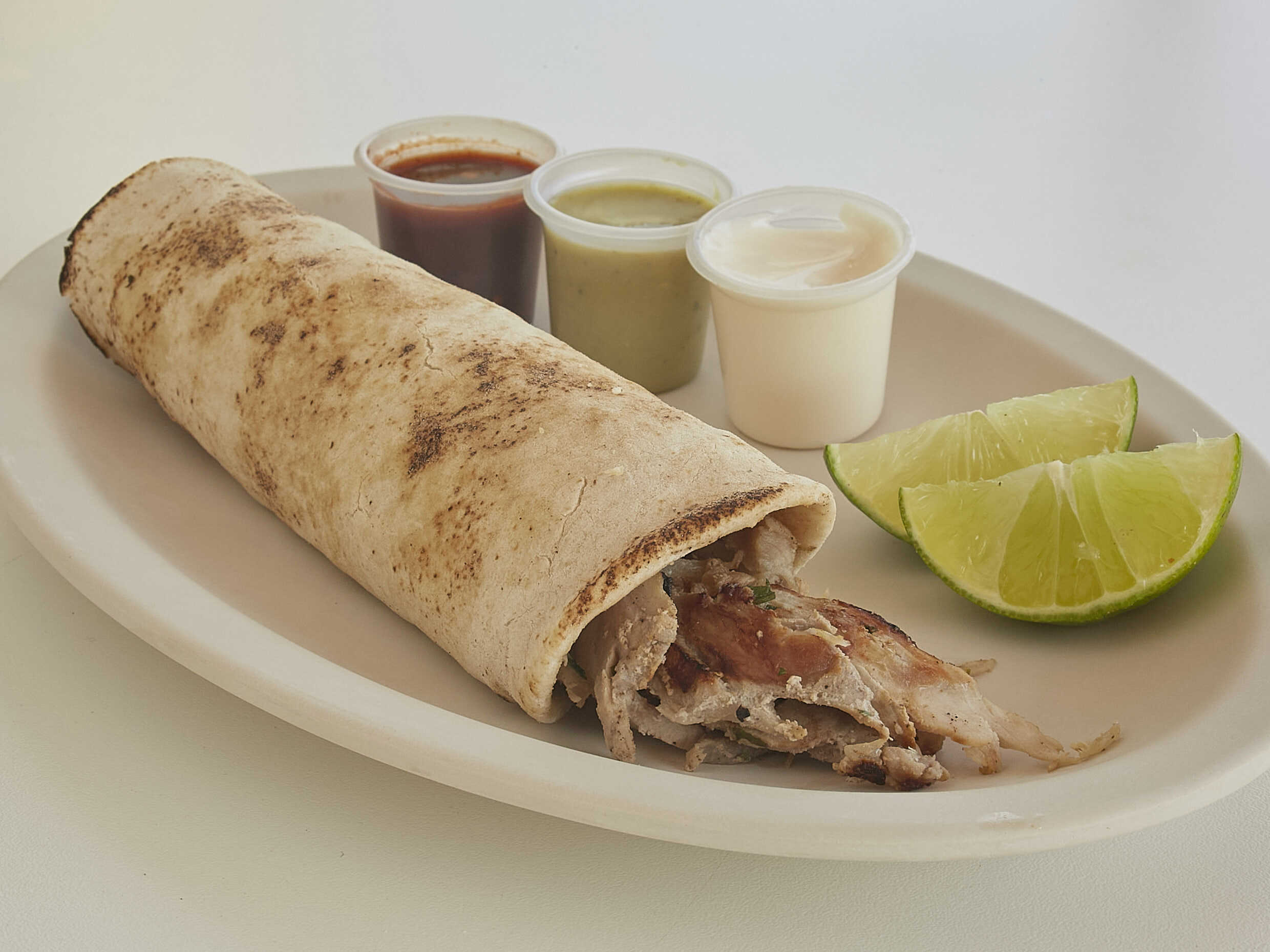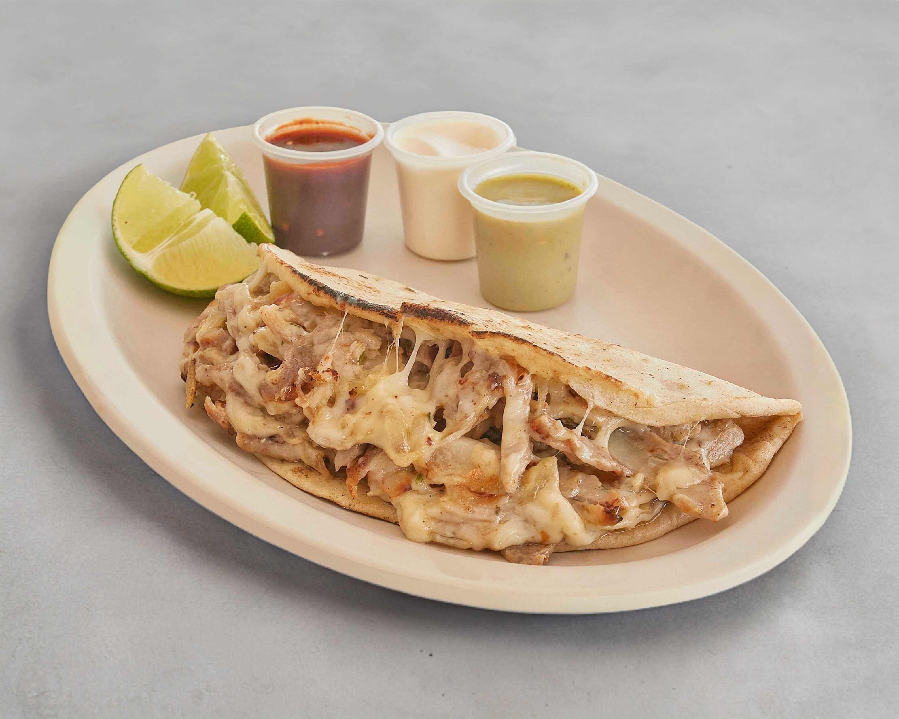 Tortilla de maíz con carne árabe. Incluye: salsa de chipotle, salsa de habanero, aderezo de ajo y limones
