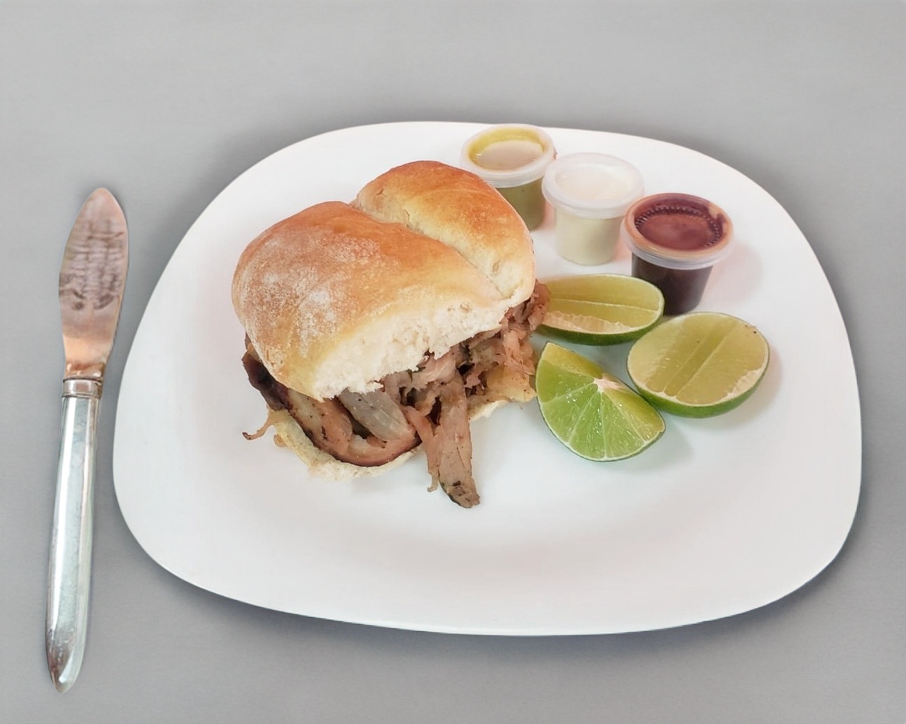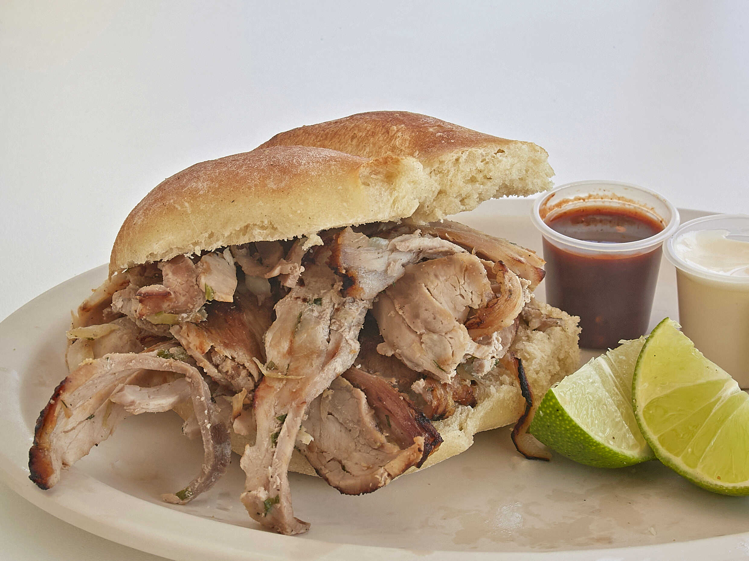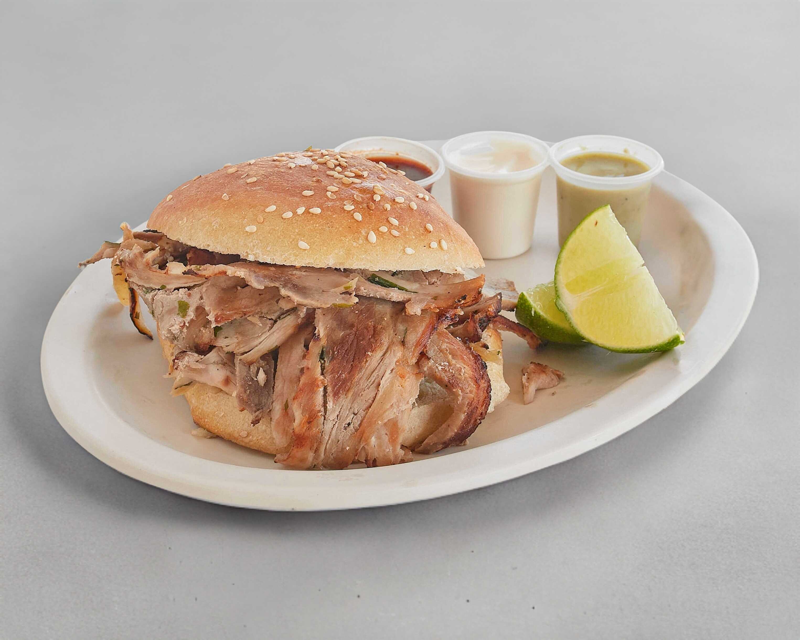 Cemita tradicional con carne árabe. Incluye: salsa de chipotle, salsa de habanero, aderezo de ajo y limones