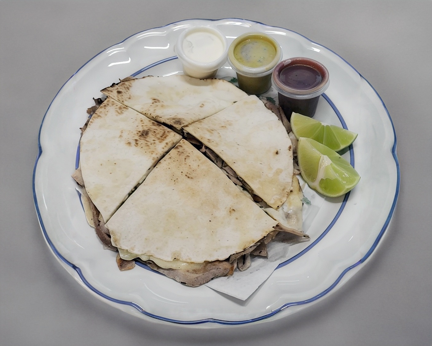 2 Panes árabes con carne árabe y nuestra mezcla especial de quesos. Incluye: salsa de chipotle, salsa de habanero, aderezo de ajo y limones