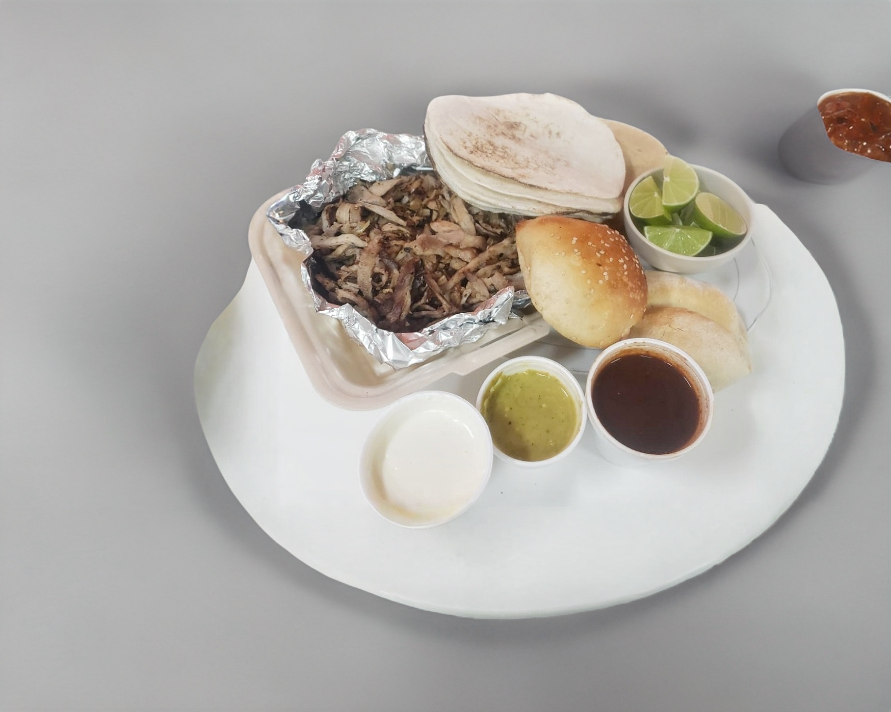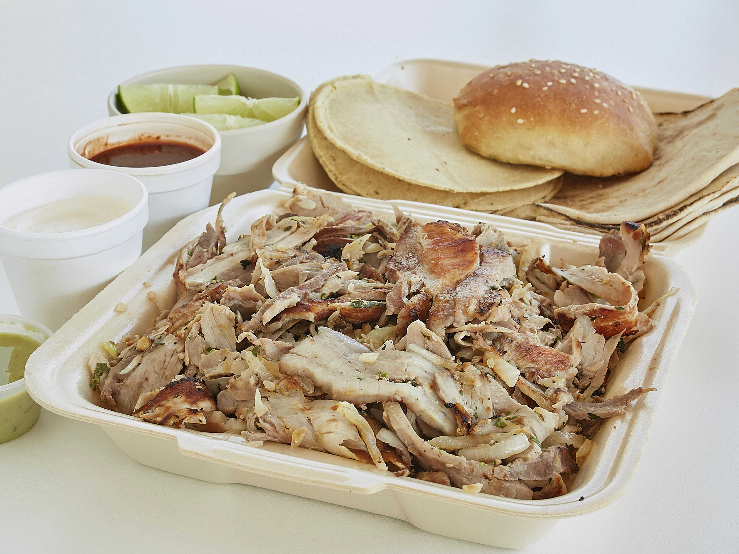 1 Kg de Carne Árabe. 10 Panes árabes, 10 Tortillas de maíz, 1 torta, 1 cemita, salsa de chipotle, salsa de habanero, aderezo de ajo y limones