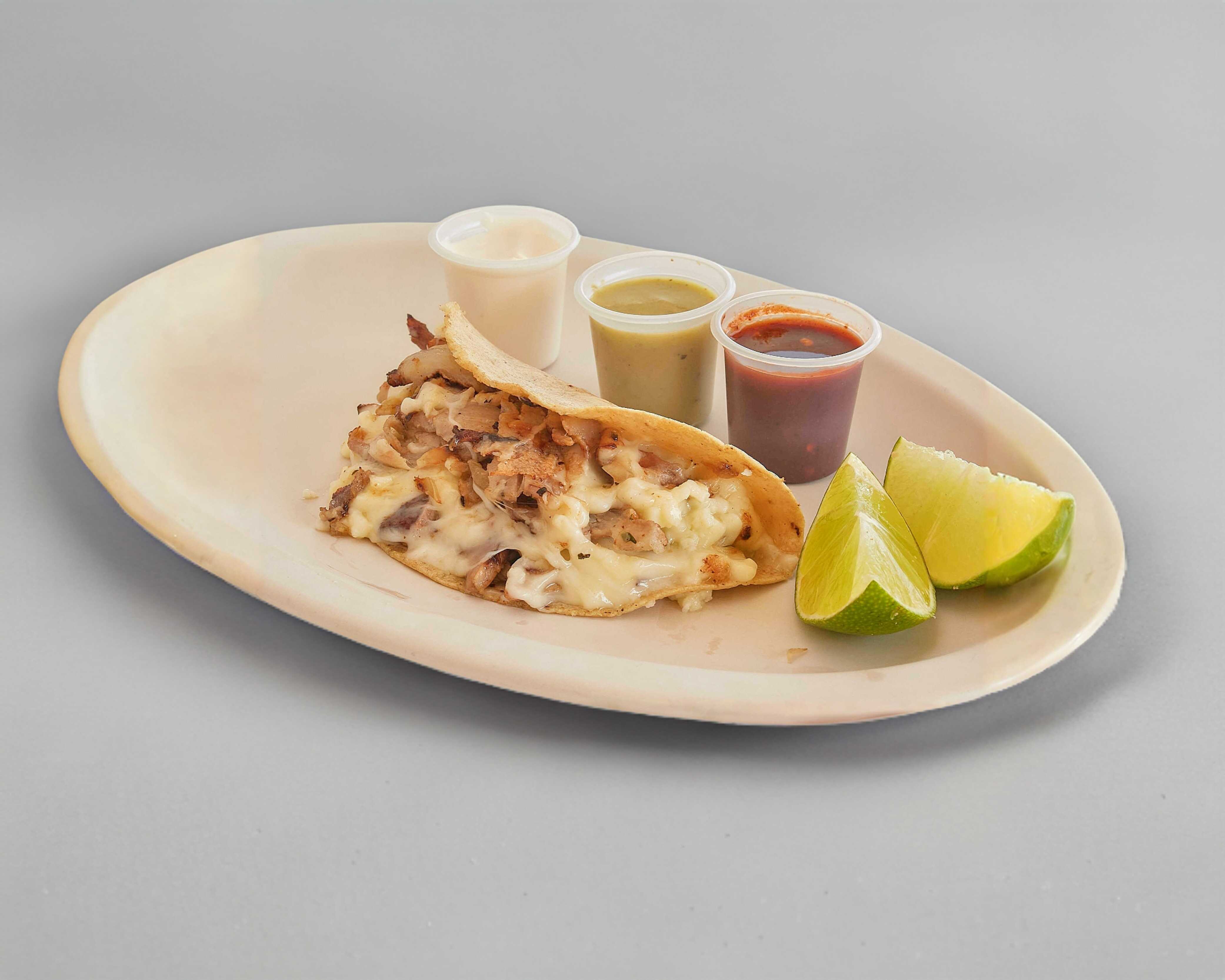 Taco oriental con carne árabe y nuestra mezcla especial de quesos. Incluye: salsa de chipotle, salsa de habanero, aderezo de ajo y limones