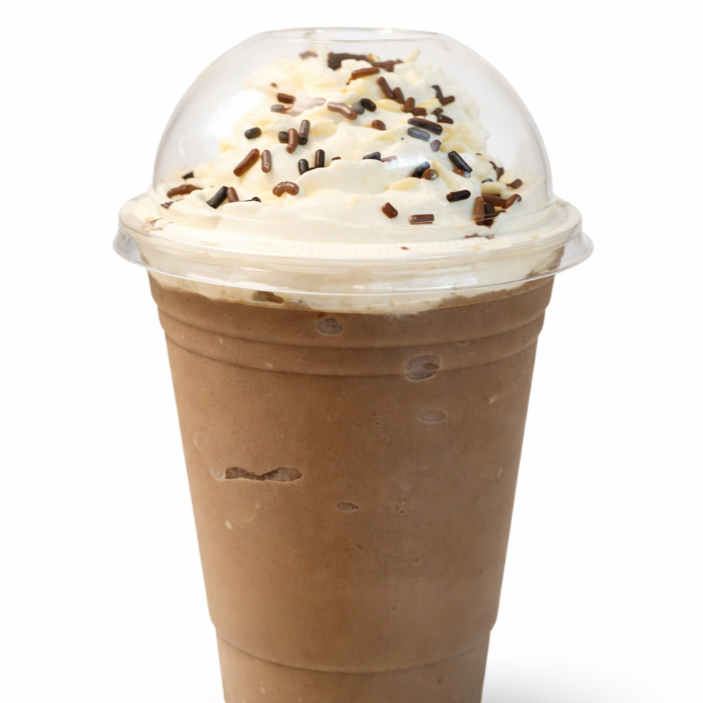Rico frappe con café de la casa, crema batida y granillo de tres chocolates.