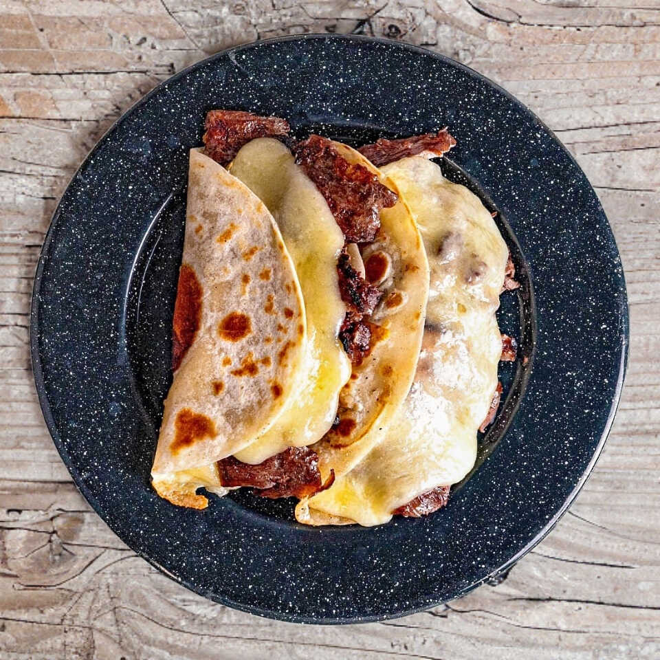 Tortilla de harina artesanal, mezcla de quesillo y gouda, cilantro, cebolla y guacamole