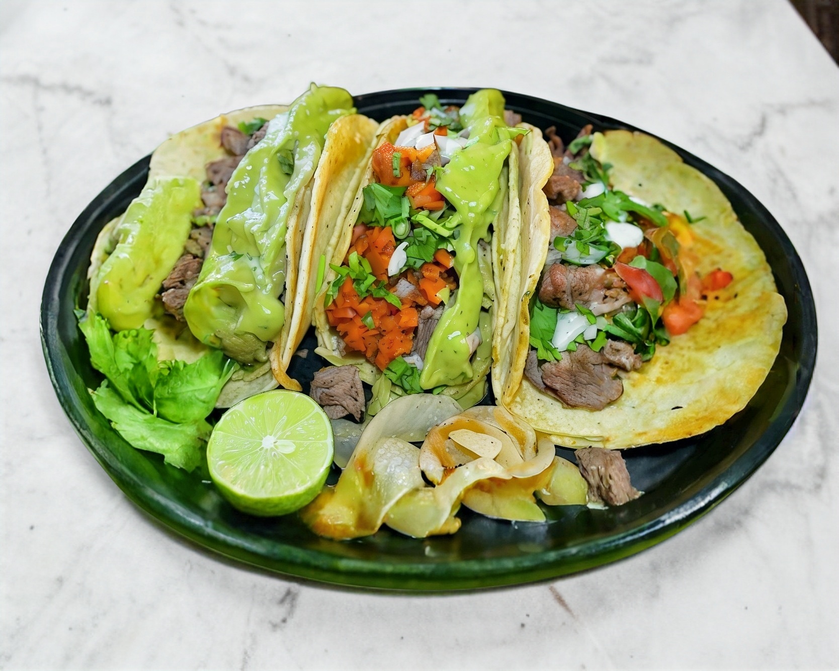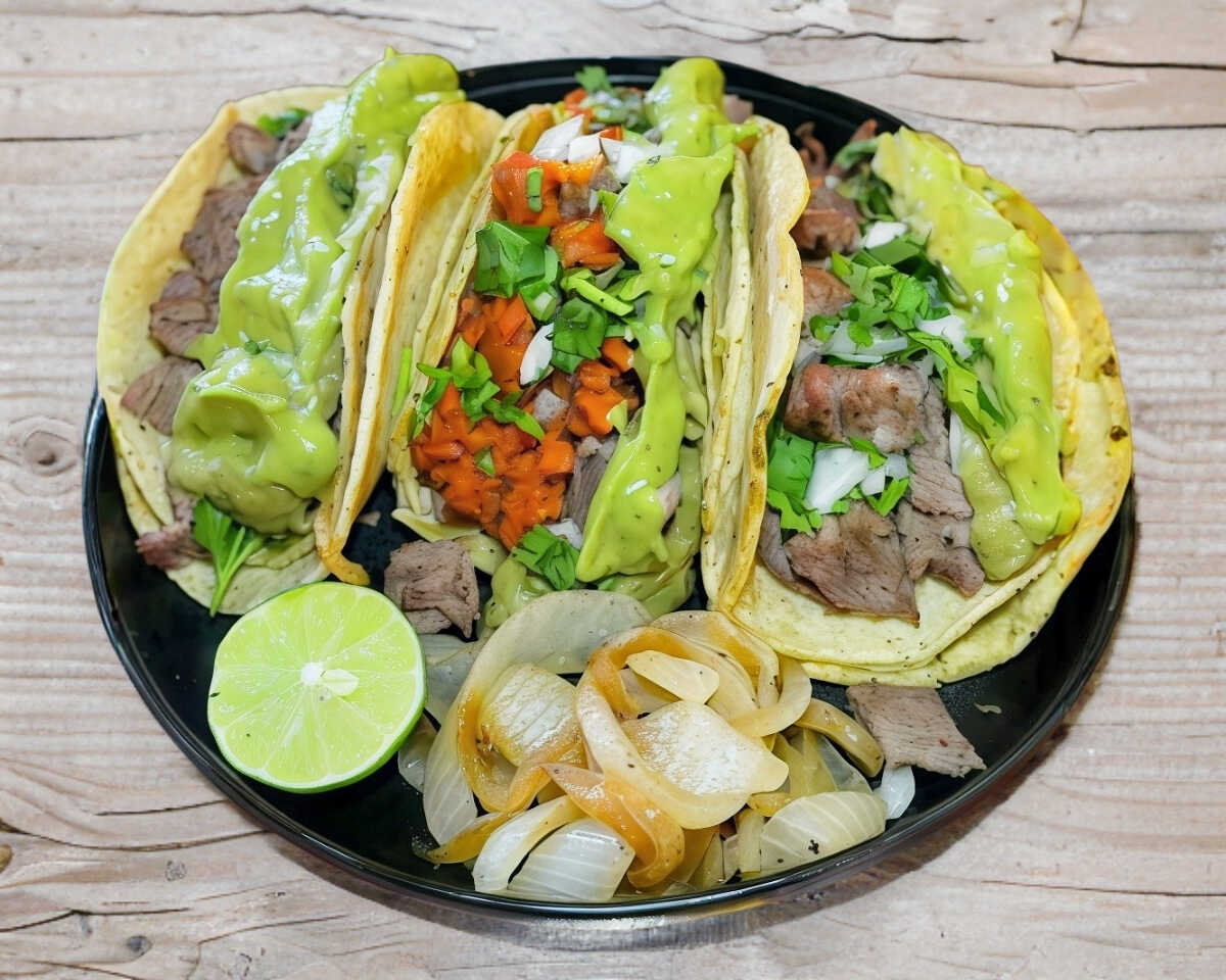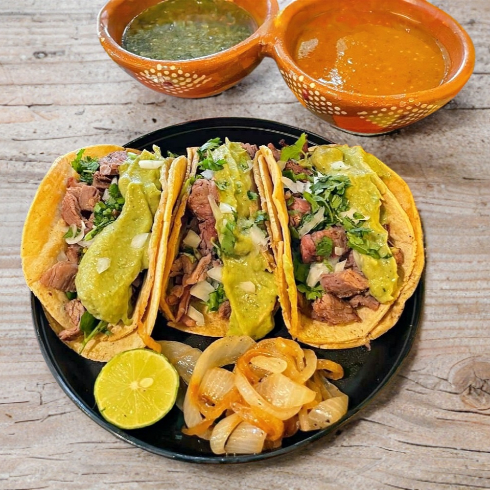 Tortilla de harina artesanal, bistec sirloin, guacamole, cilantro y cebolla,Salsa aparte (Roja de chile de arbol+Morita y Verde de jalapeño con tampico) + limones