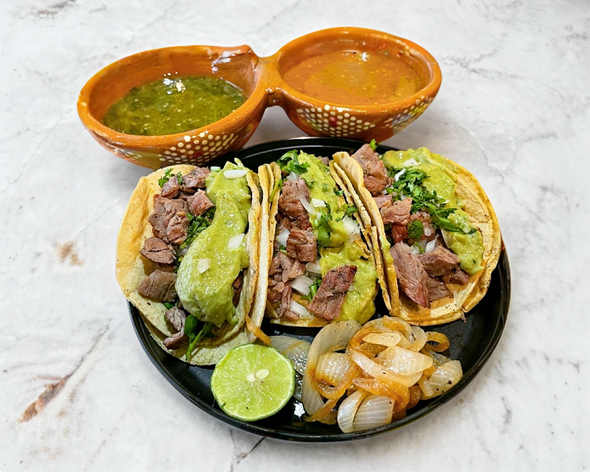 Bistec sirloin, chorizo asado , guacamole, cilantro y cebolla Salsa aparte (Roja de chile de arbol+Morita y Verde de jalapeño con tampico) + limones