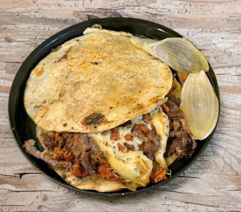 TORTILLA DE HARINA ARTESANAL,MEZCLA DE QUESILLO Y GOUDA, GUACAMOLE, CILANTRO Y CEBOLLA