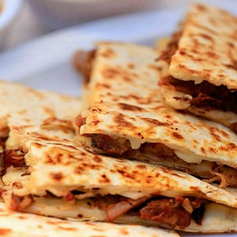 2 Tortillas de harina, mezcla de quesillo, y gouda, A tu gusto (guacamole, cilantro y cebolla.)