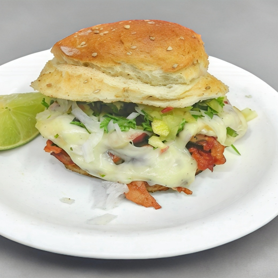 Chuleta, tocino, pimiento morron, cebolla y queso