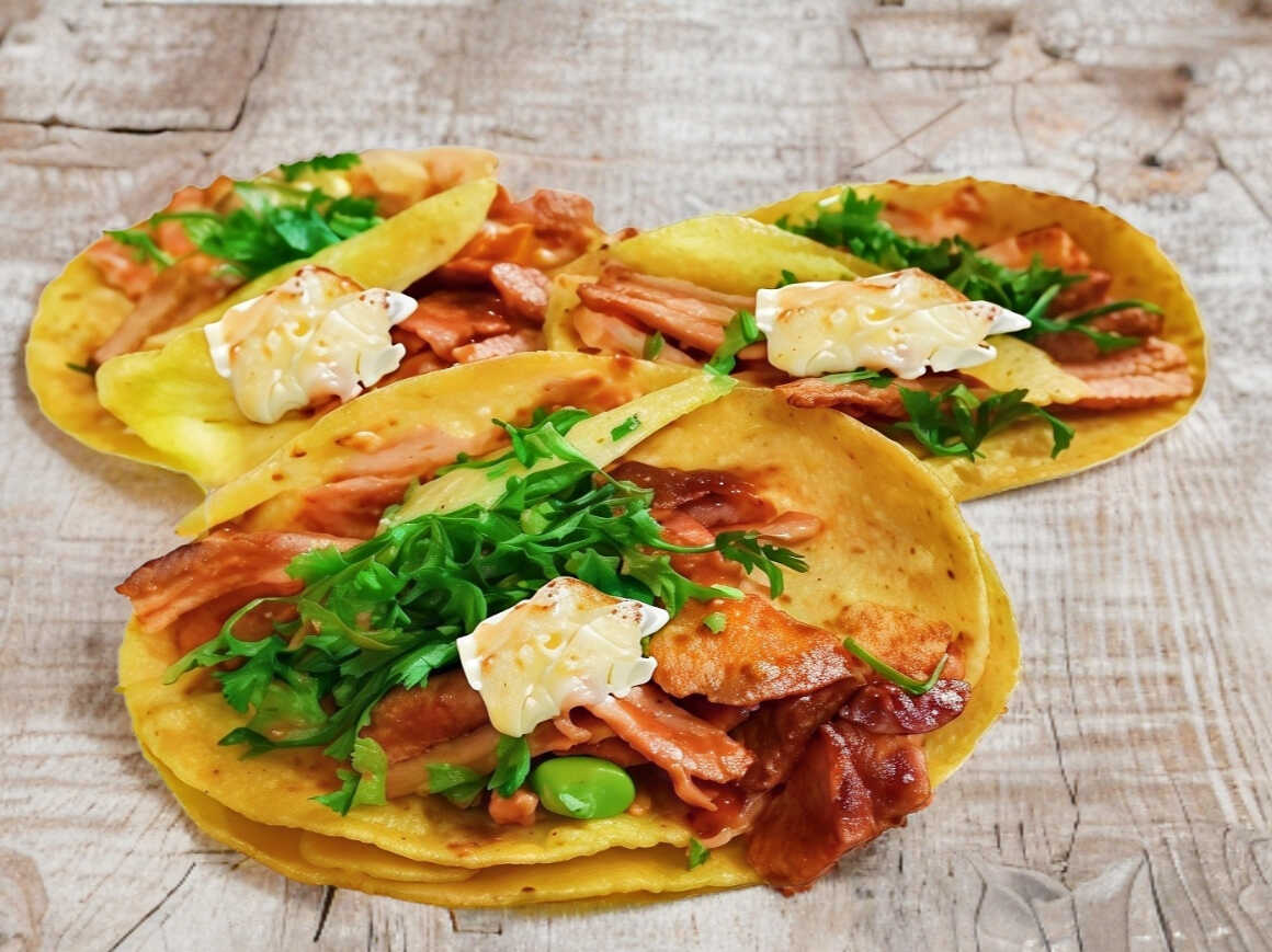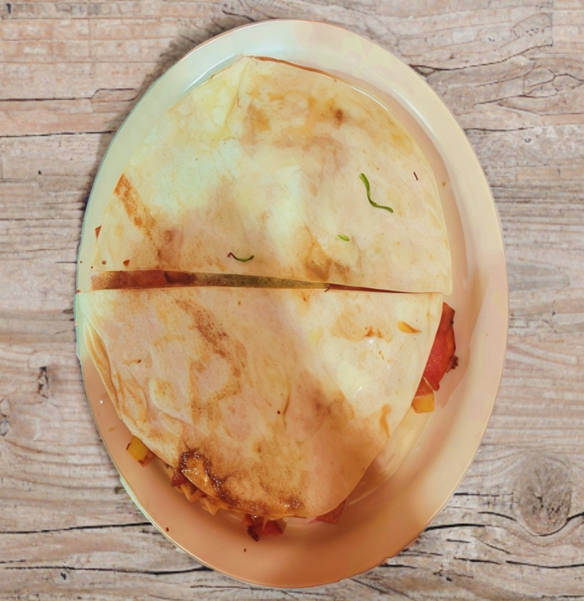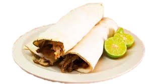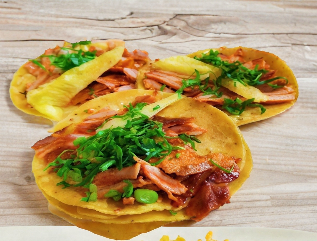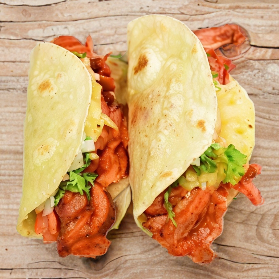 Dos tortillas de harina, carne al pastor, piña y queso.