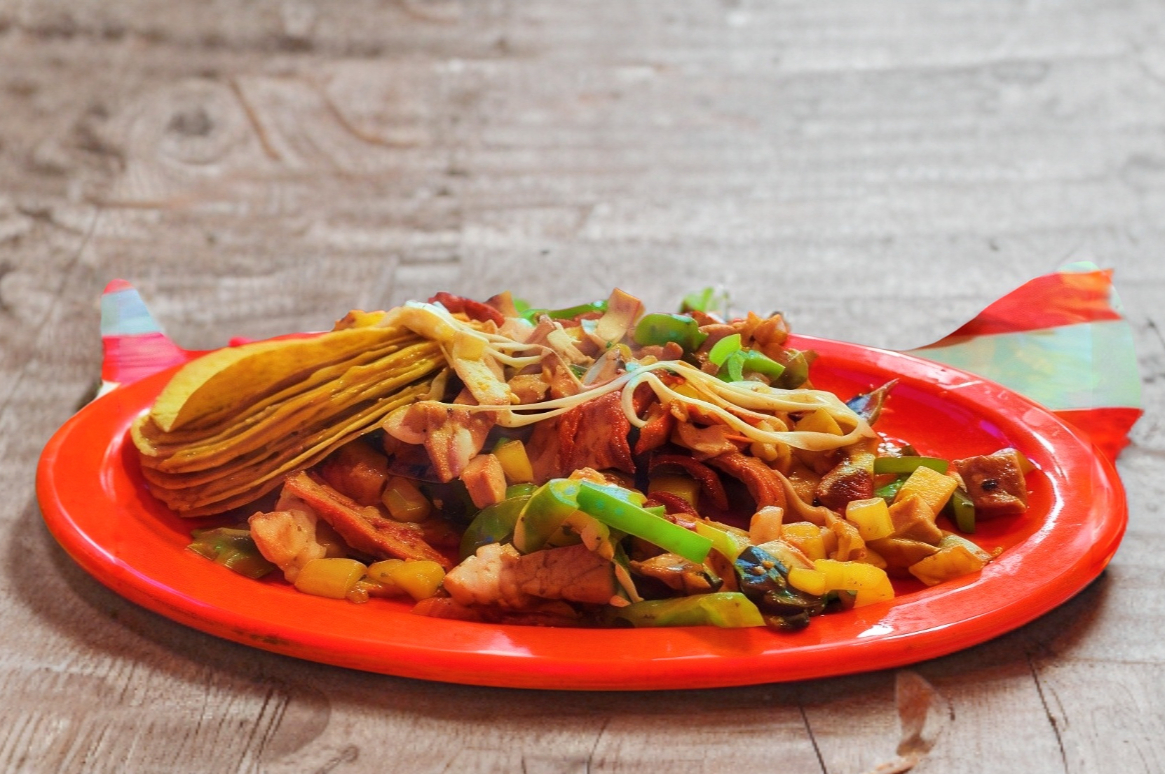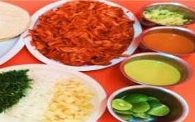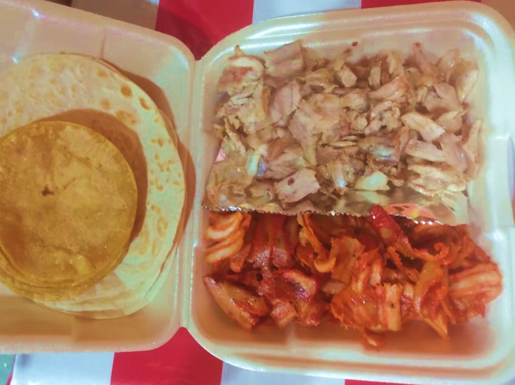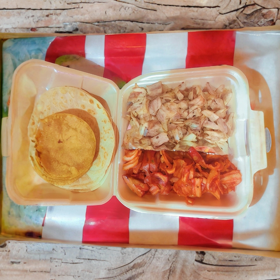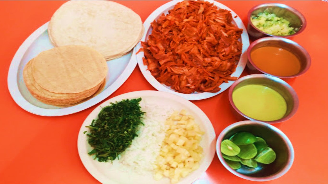Con 10 tortillas de harina, 30 de maiz, cebolla, cilantro, piña, limones y salsas.