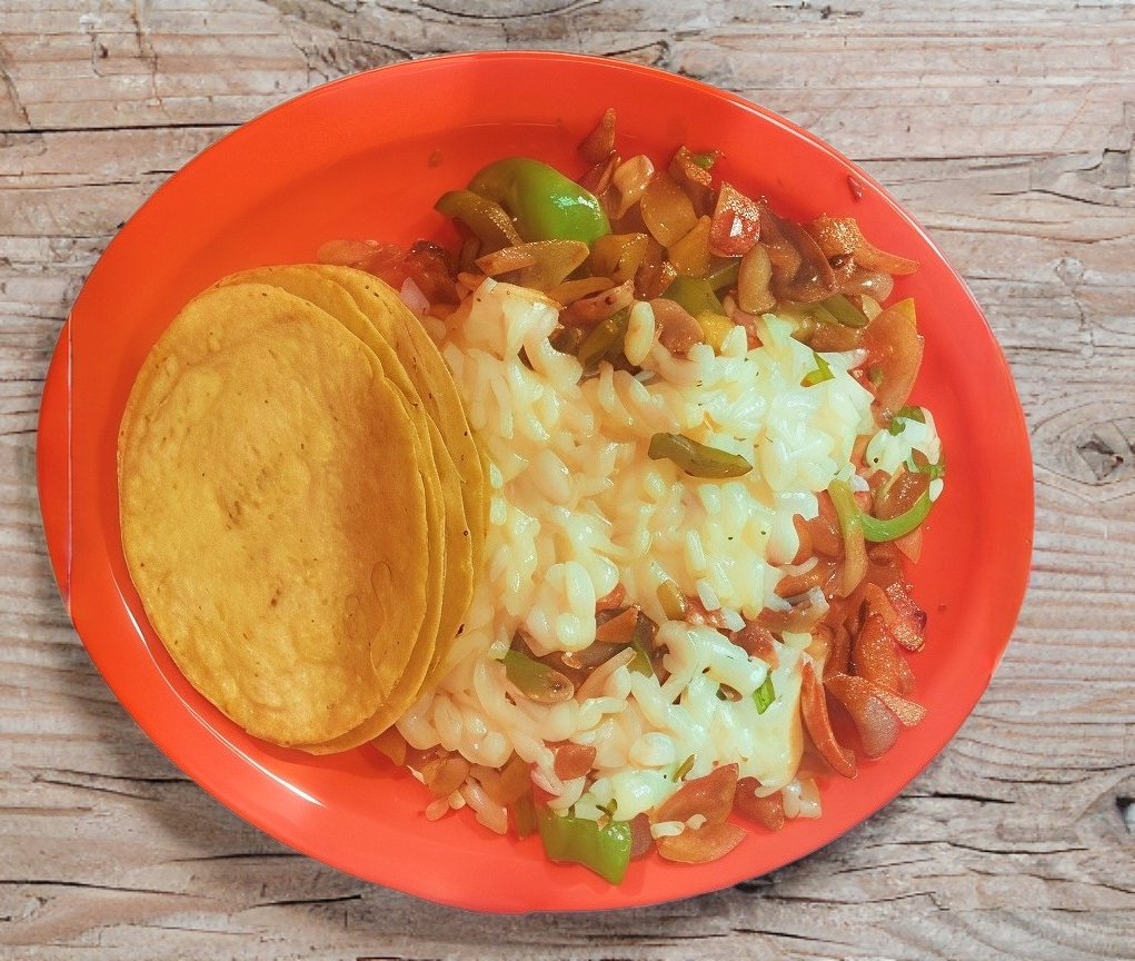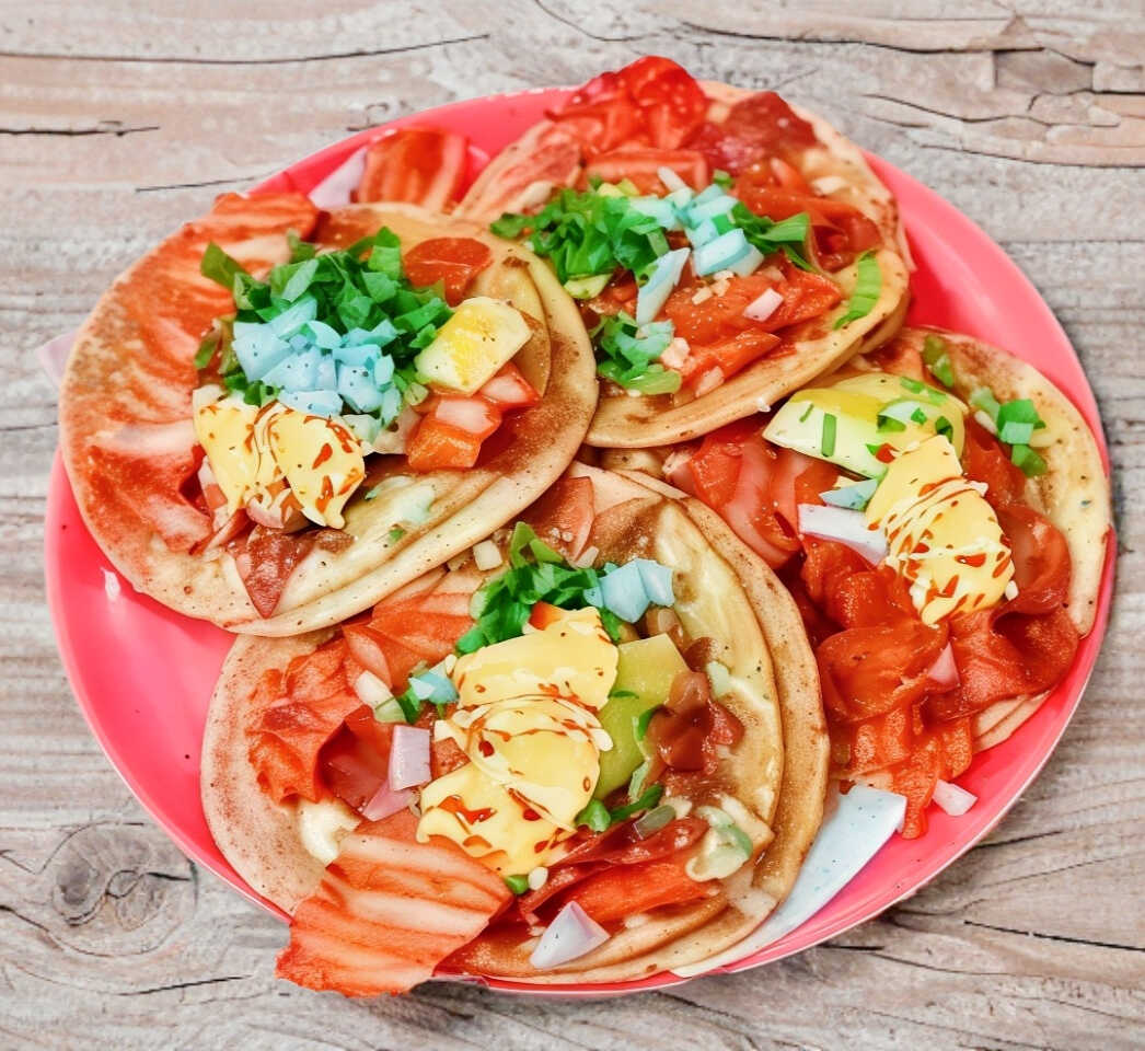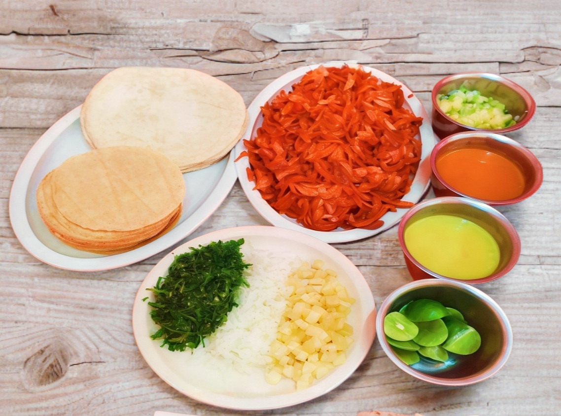 Con 10 tortillas de harina, 30 de maiz, cebolla, cilantro, piña, limones y salsas.