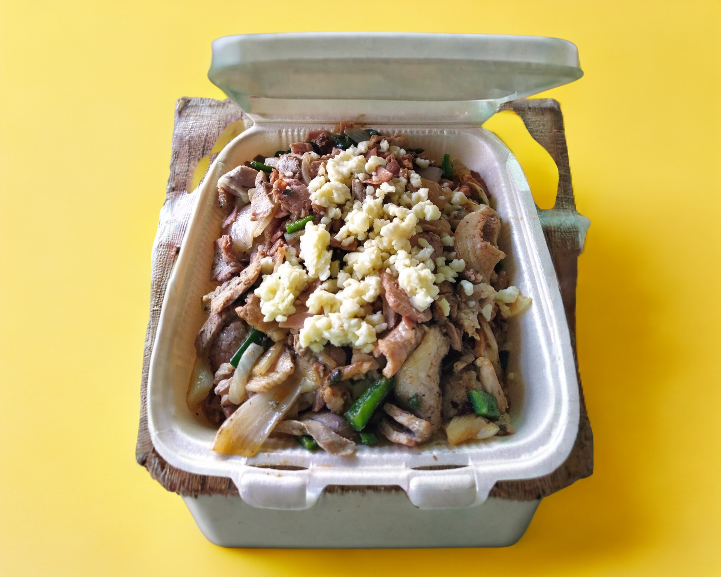 sabana de puerco, nopales, cilantro, cebolla, salsa y queso manchego.