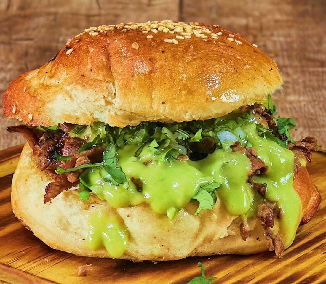 Pan de cemita, sabana de puercvo y longaniza, cilantro, cebolla y salsa de aguacate.