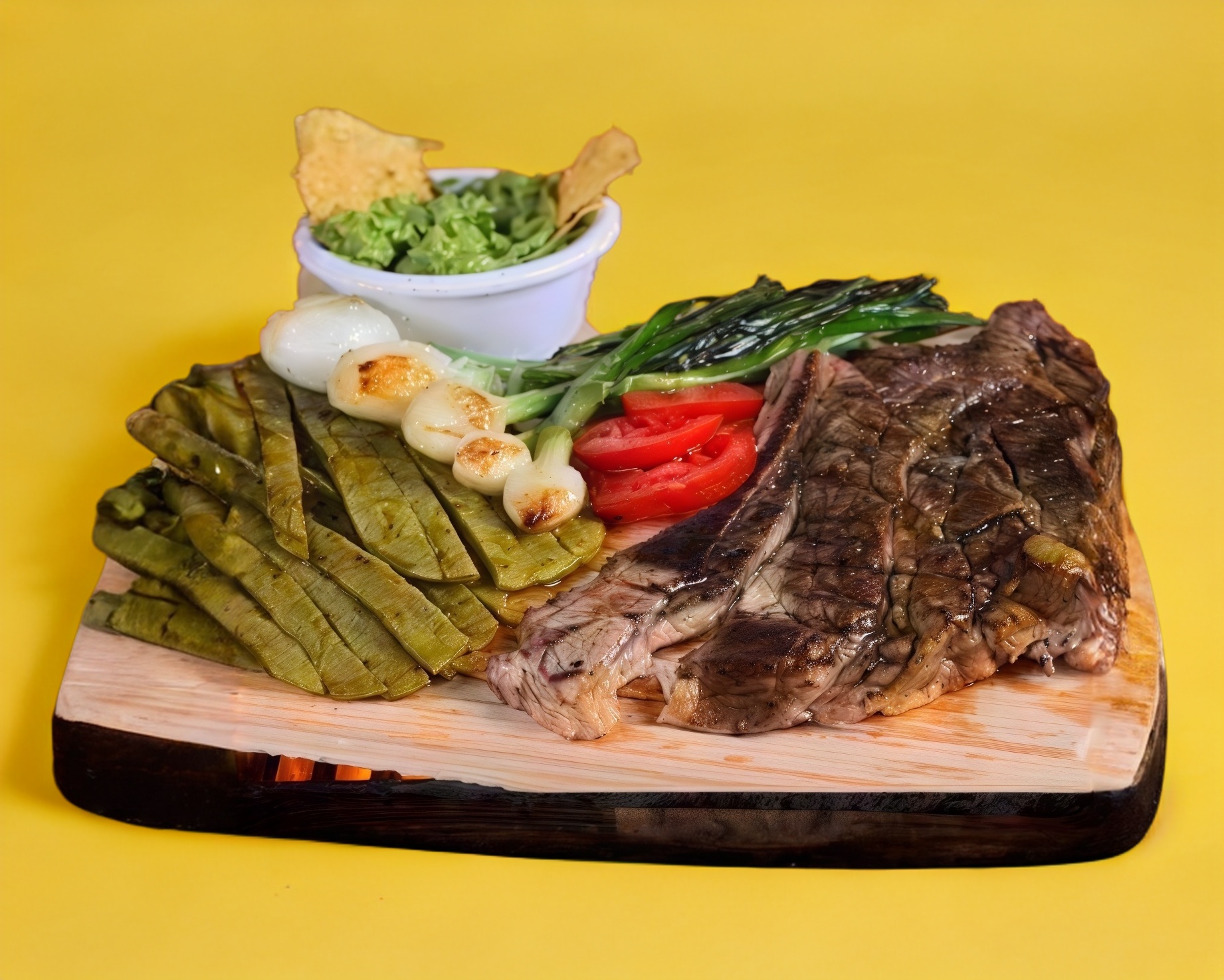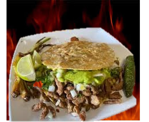 sabana de puerco y Longaniza asada, nopales, cilantro, cebolla, guacamole y queso manchego.