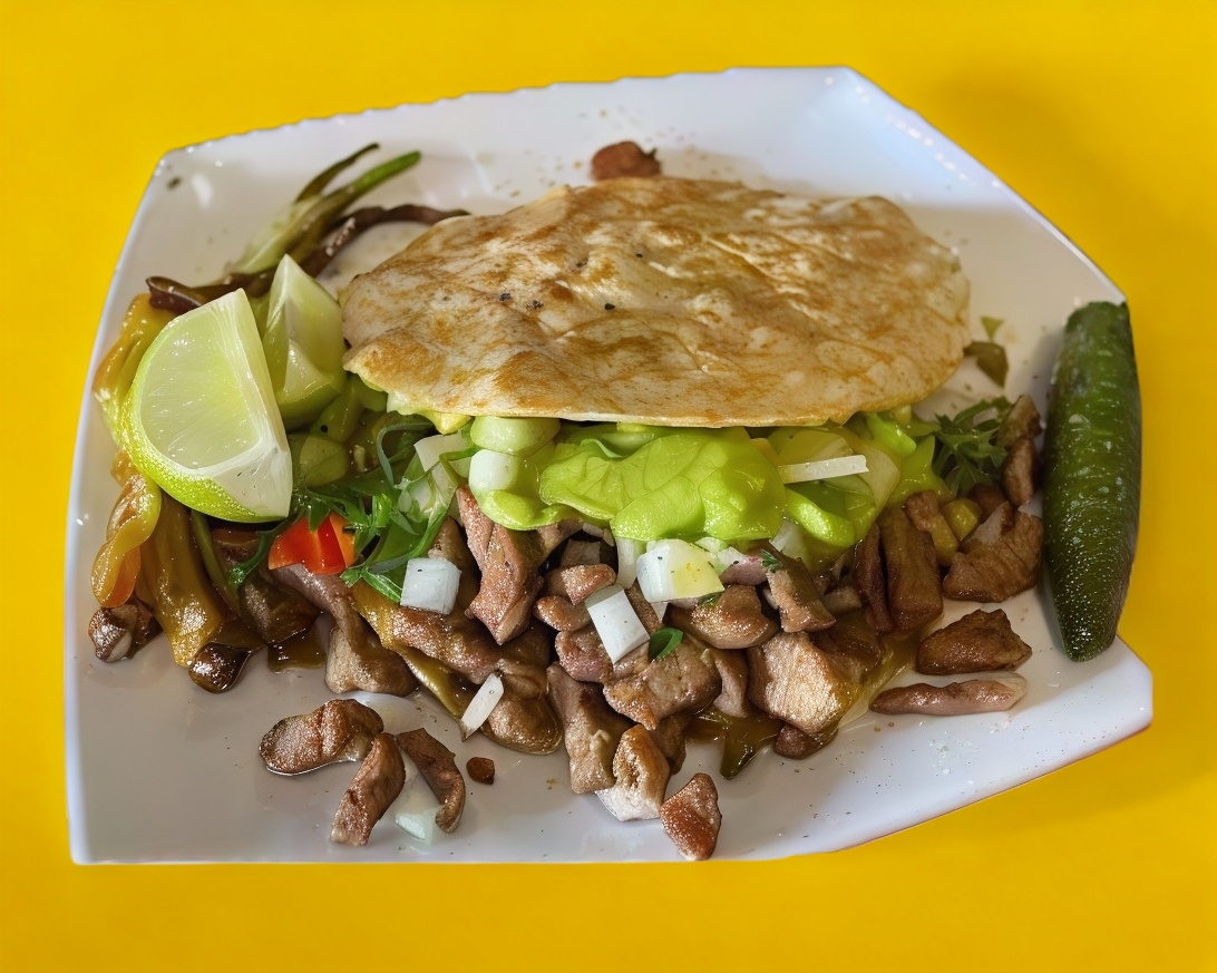 sabana de puerco y Longaniza, nopales, arroz, cilantro, cebolla, salsa de aguacate y queso manchego.