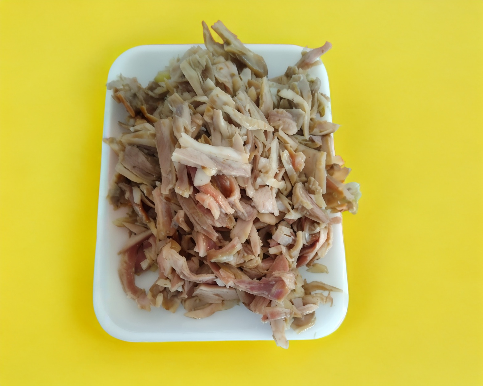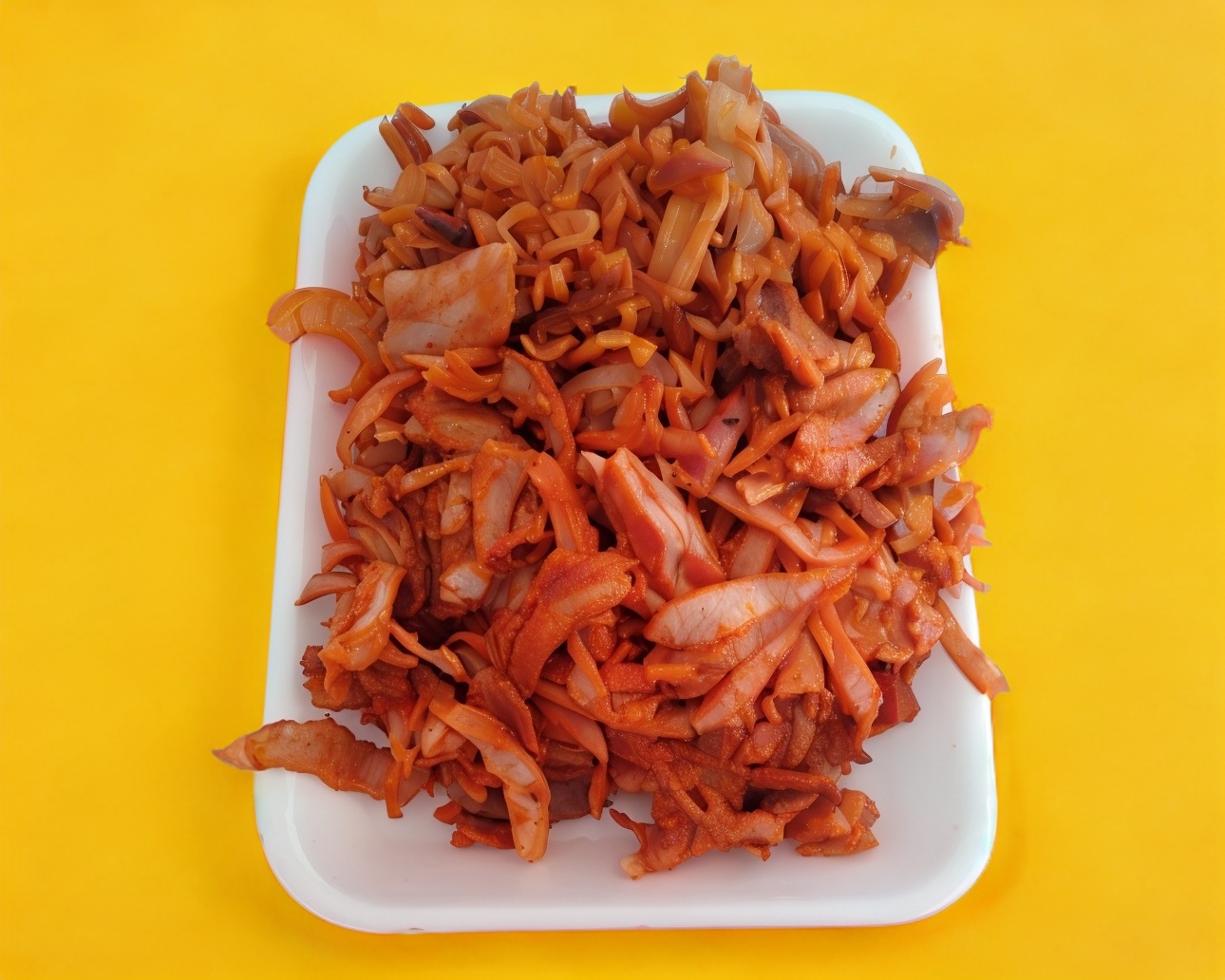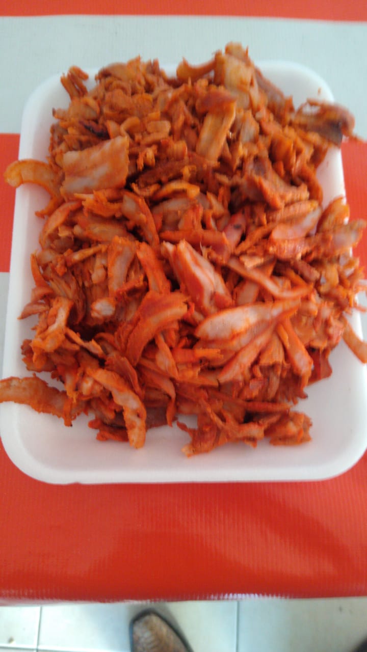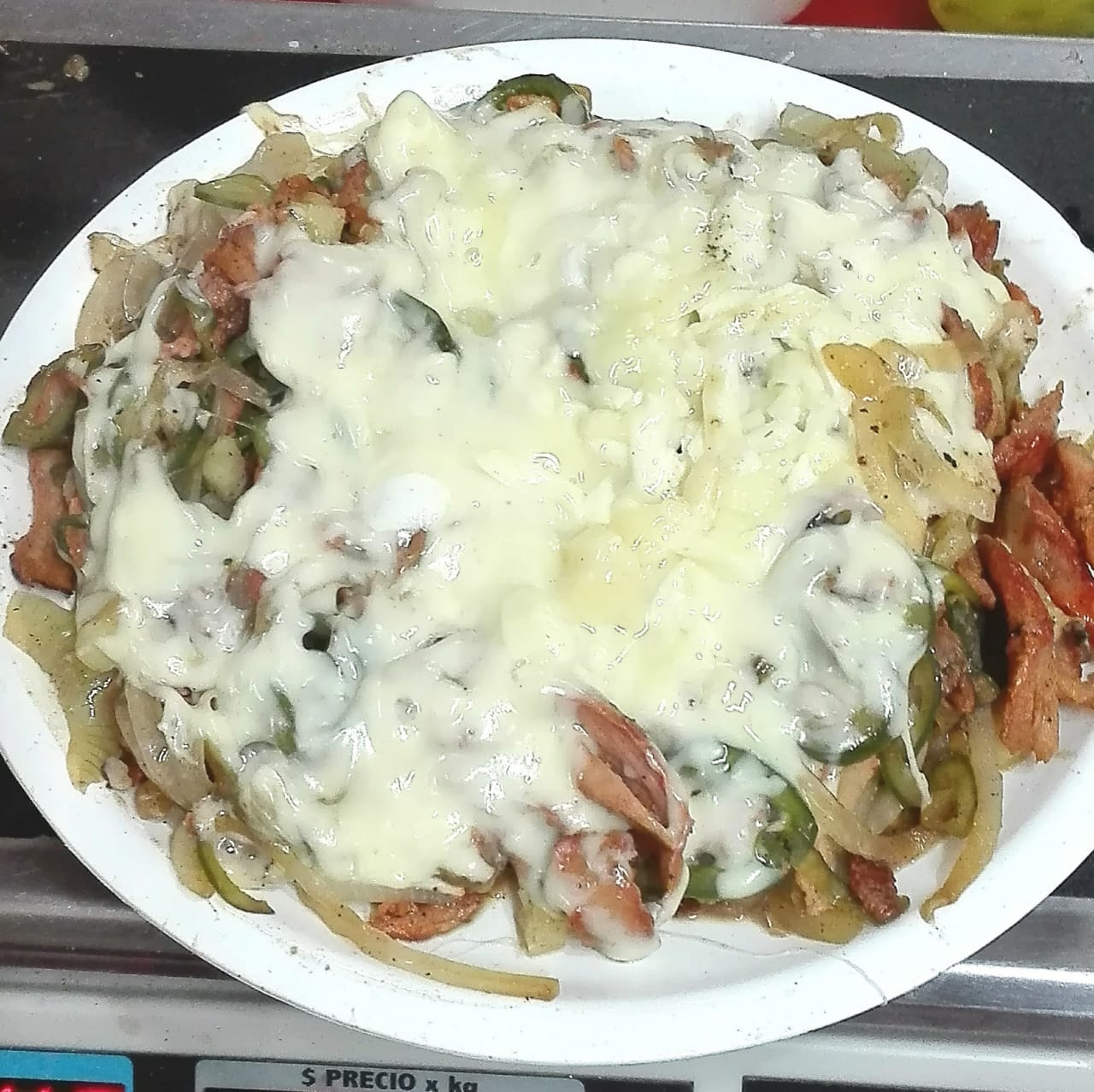 Pimiento, tocino, cebolla, carne al pastor y queso gratinado.