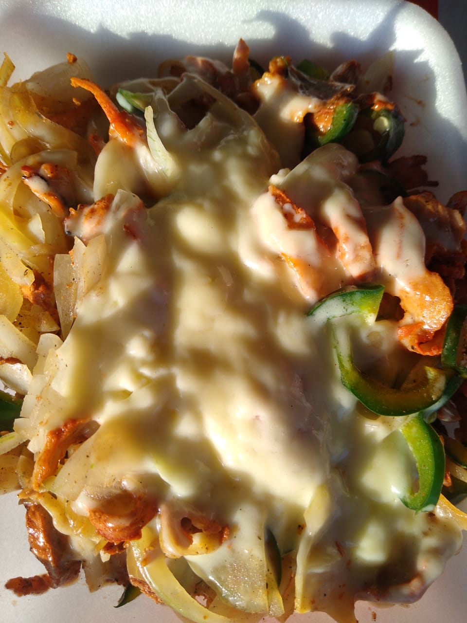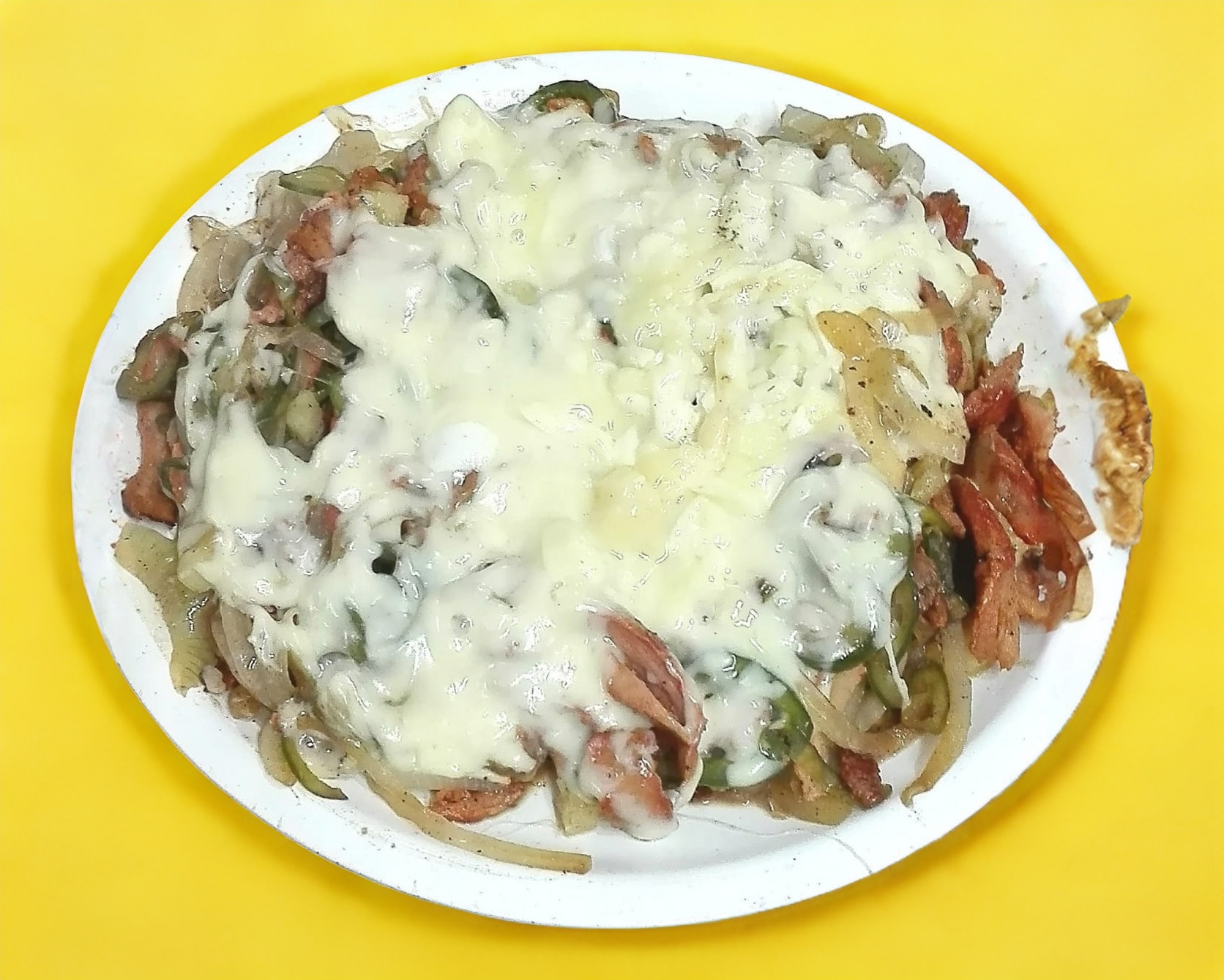Pimiento, cebolla, tocino, carne árabe y queso gratinado.