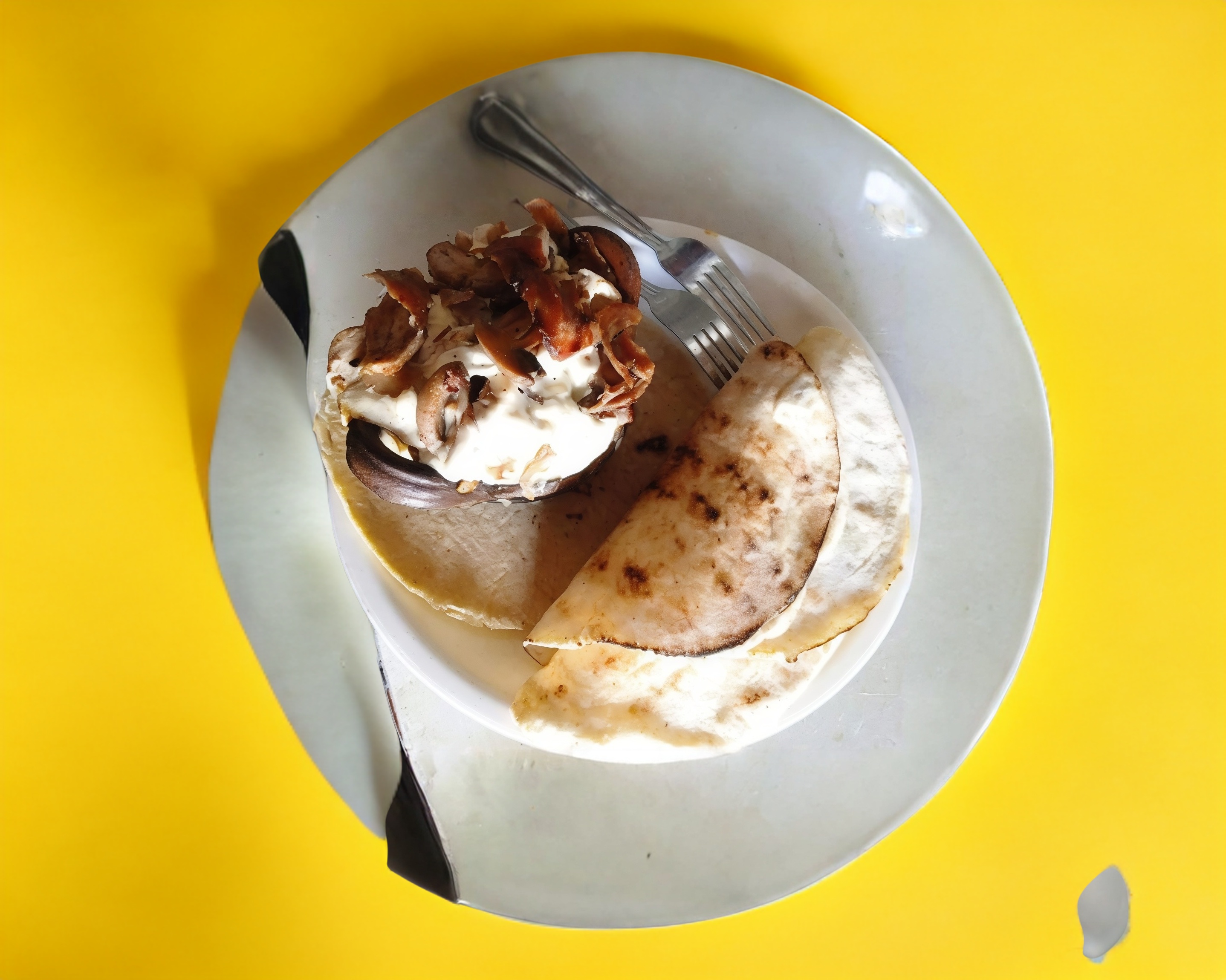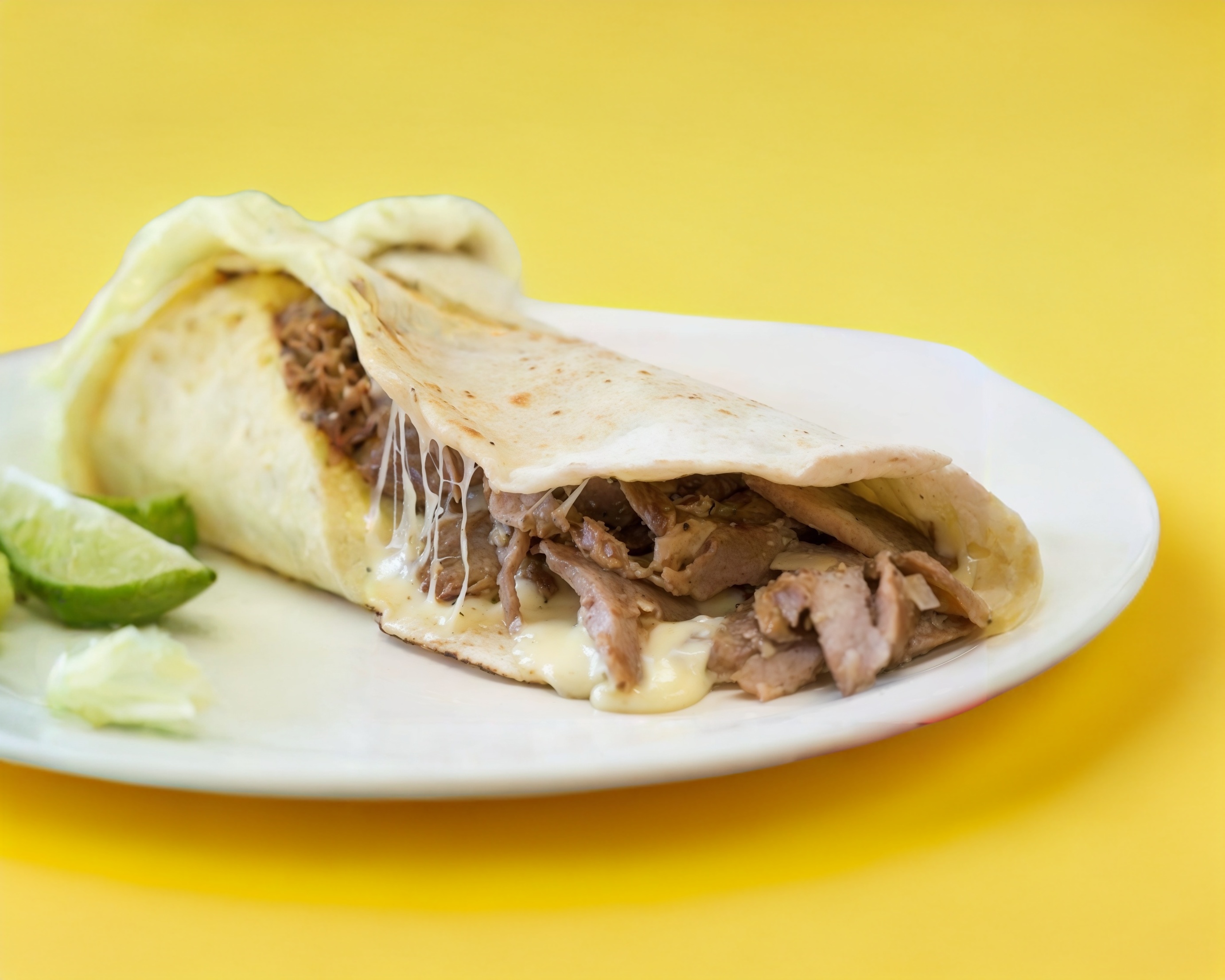 Tortilla de pan arabe con queso fundido y carne