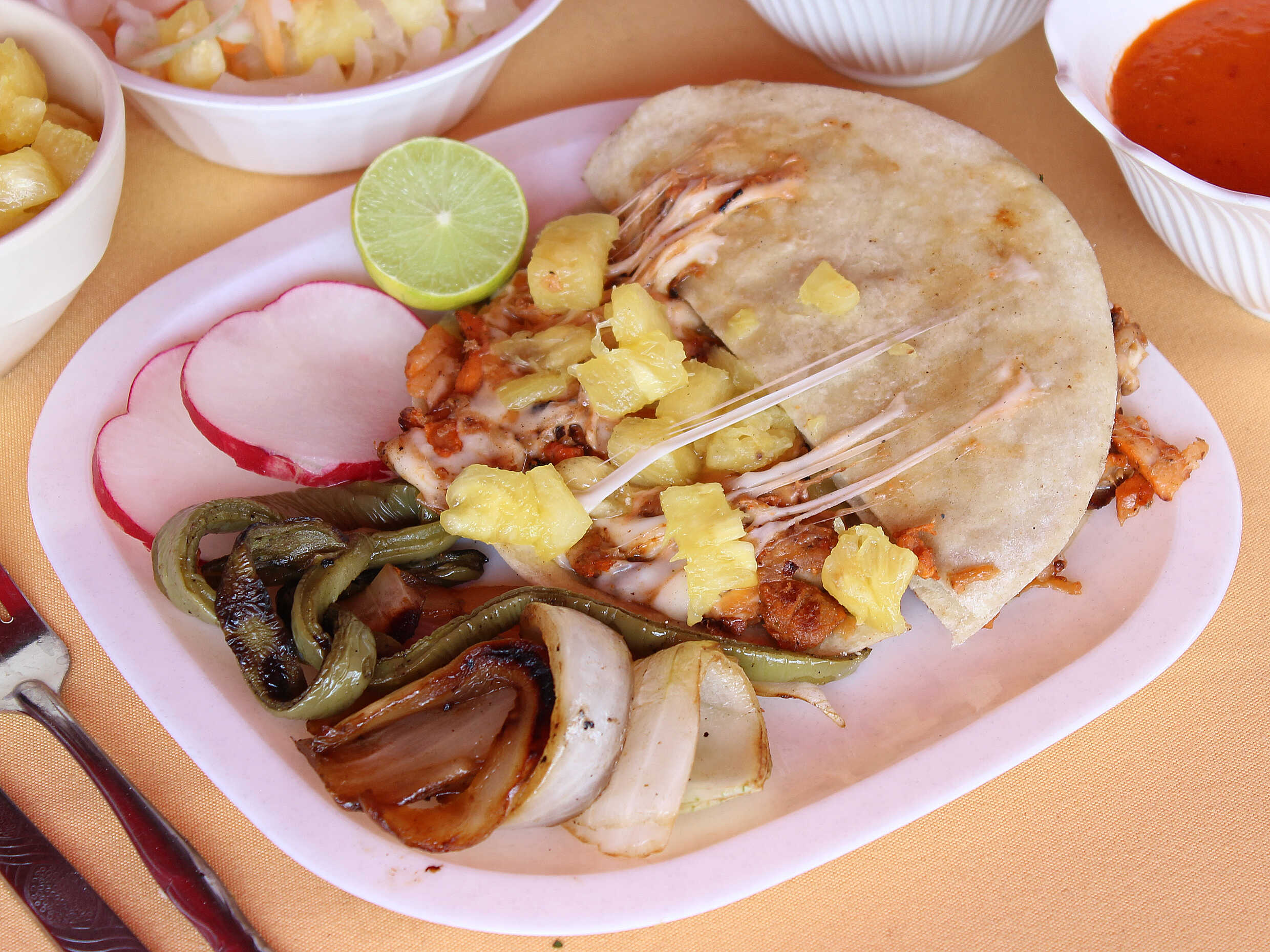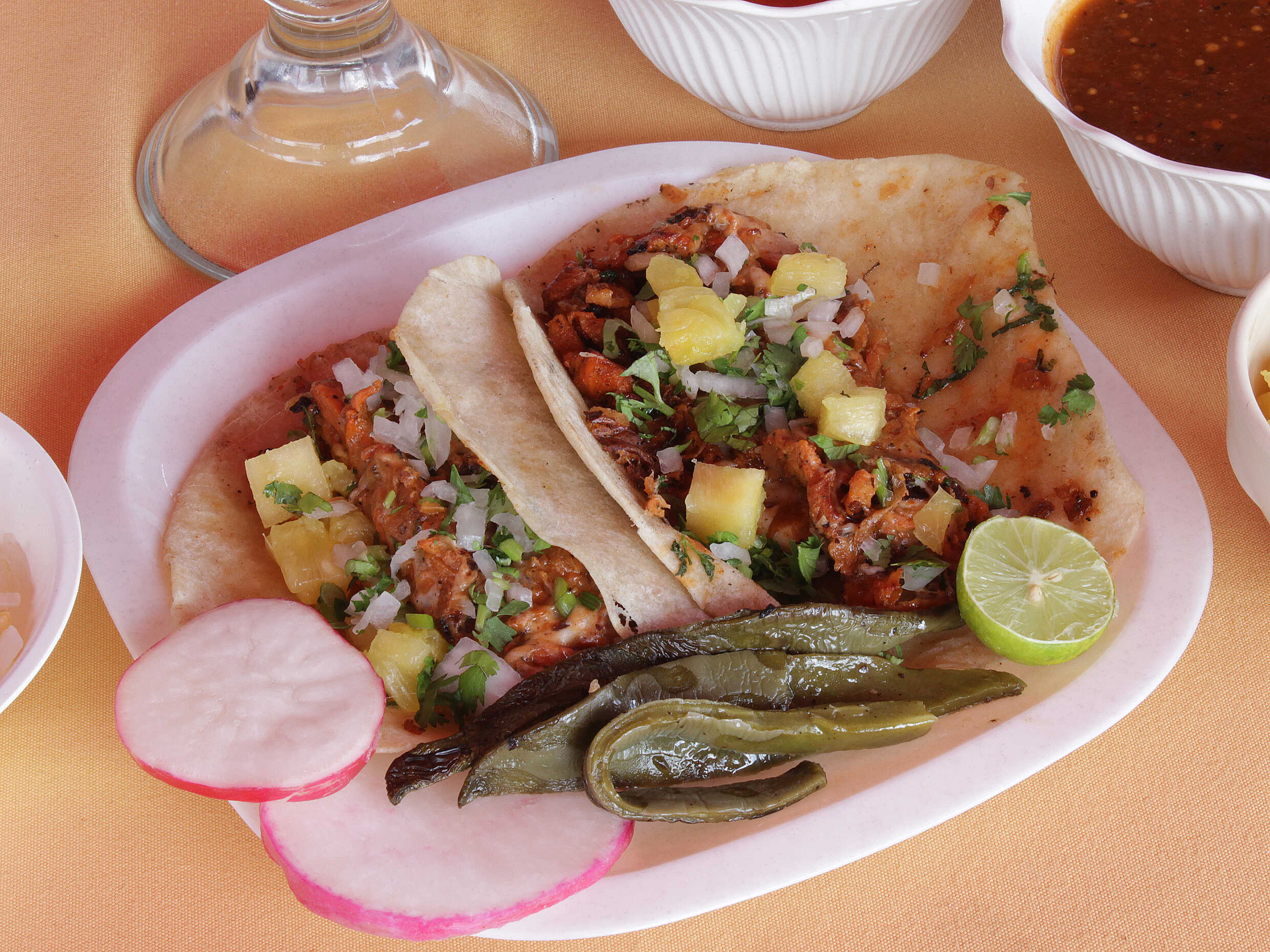 5 tortillas maíz, 2 tortillas de harina, cebolla, cilantro,piña, limones y salsas