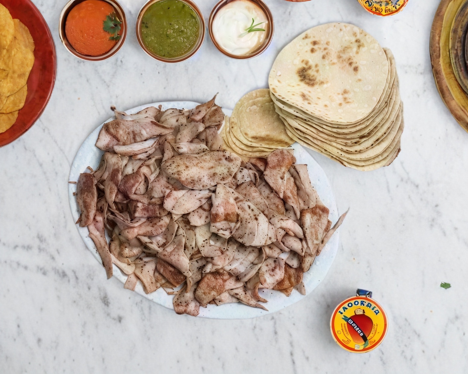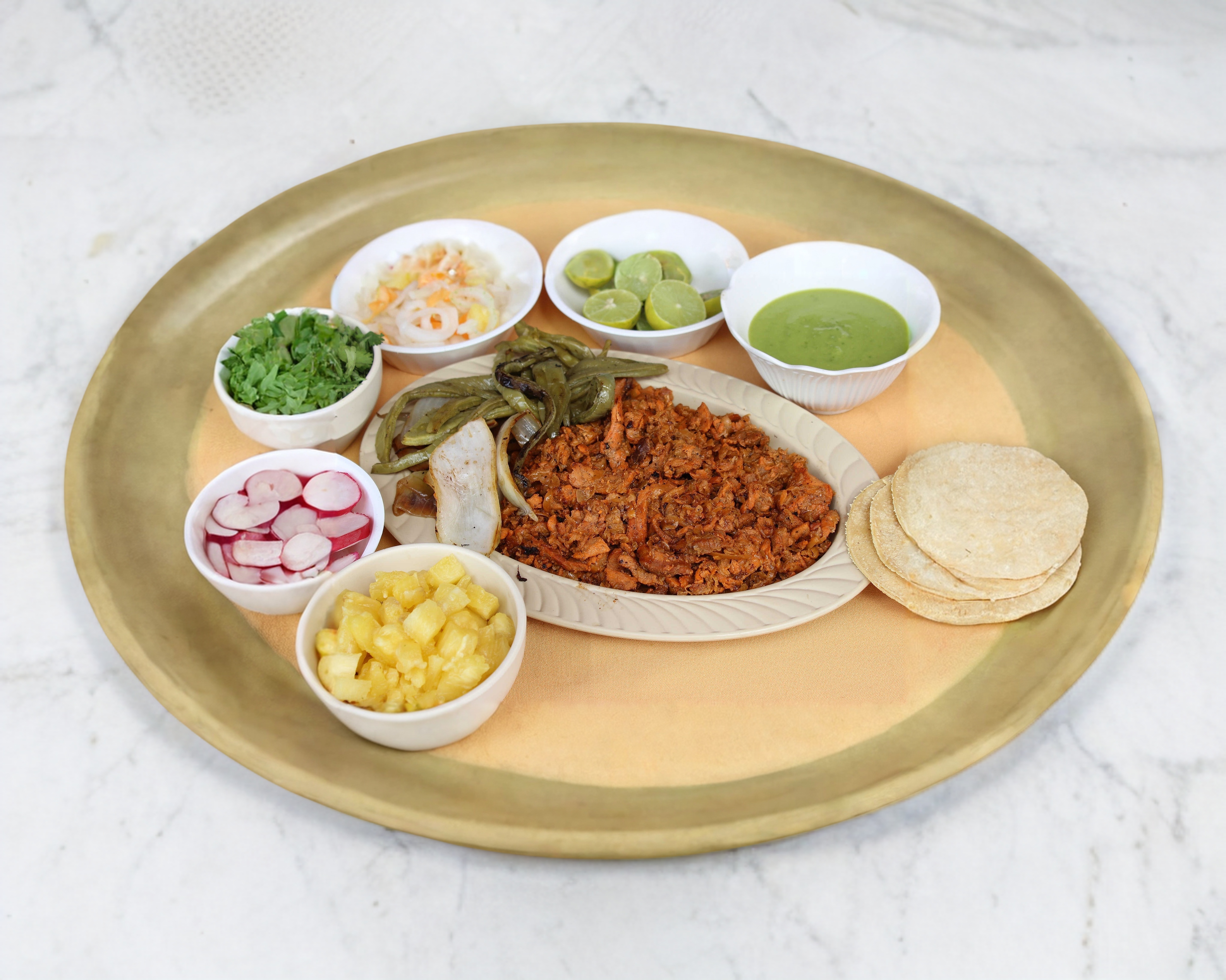 16 tortillas de maíz, 10 tortillas de harina, cilantro, cebolla, piña, limones y 3 salsas para 4 a 5 persona