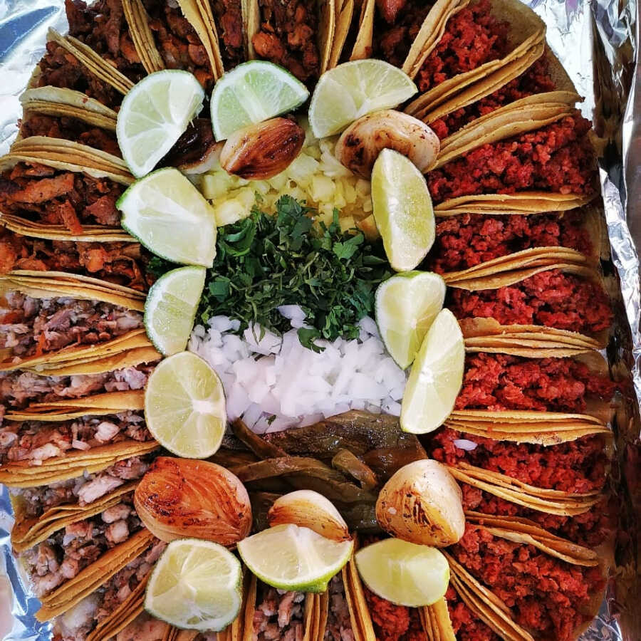 10 tortillas maíz, 5 tortillas de harina, cebolla, cilantro, piña, limones y 3 salsas
