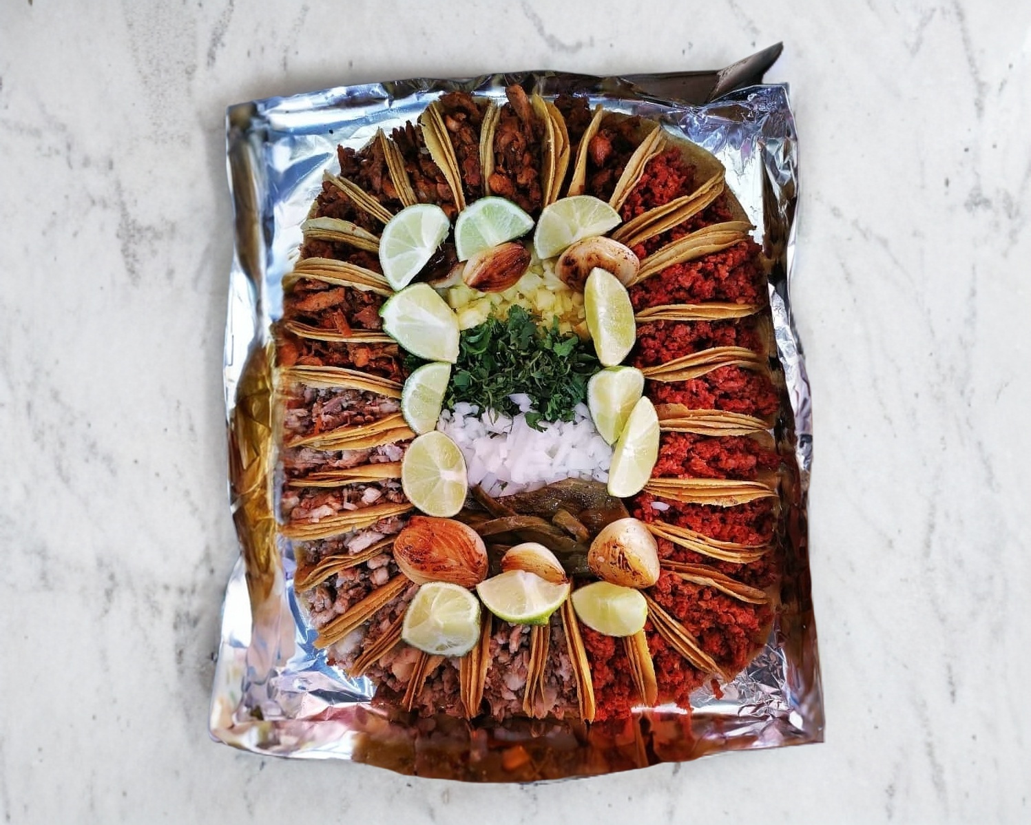 22 tacos surtidos de suadero longaniza y pastror, acompañado de nuestras exquiisitas zalsas y adornado con dulces