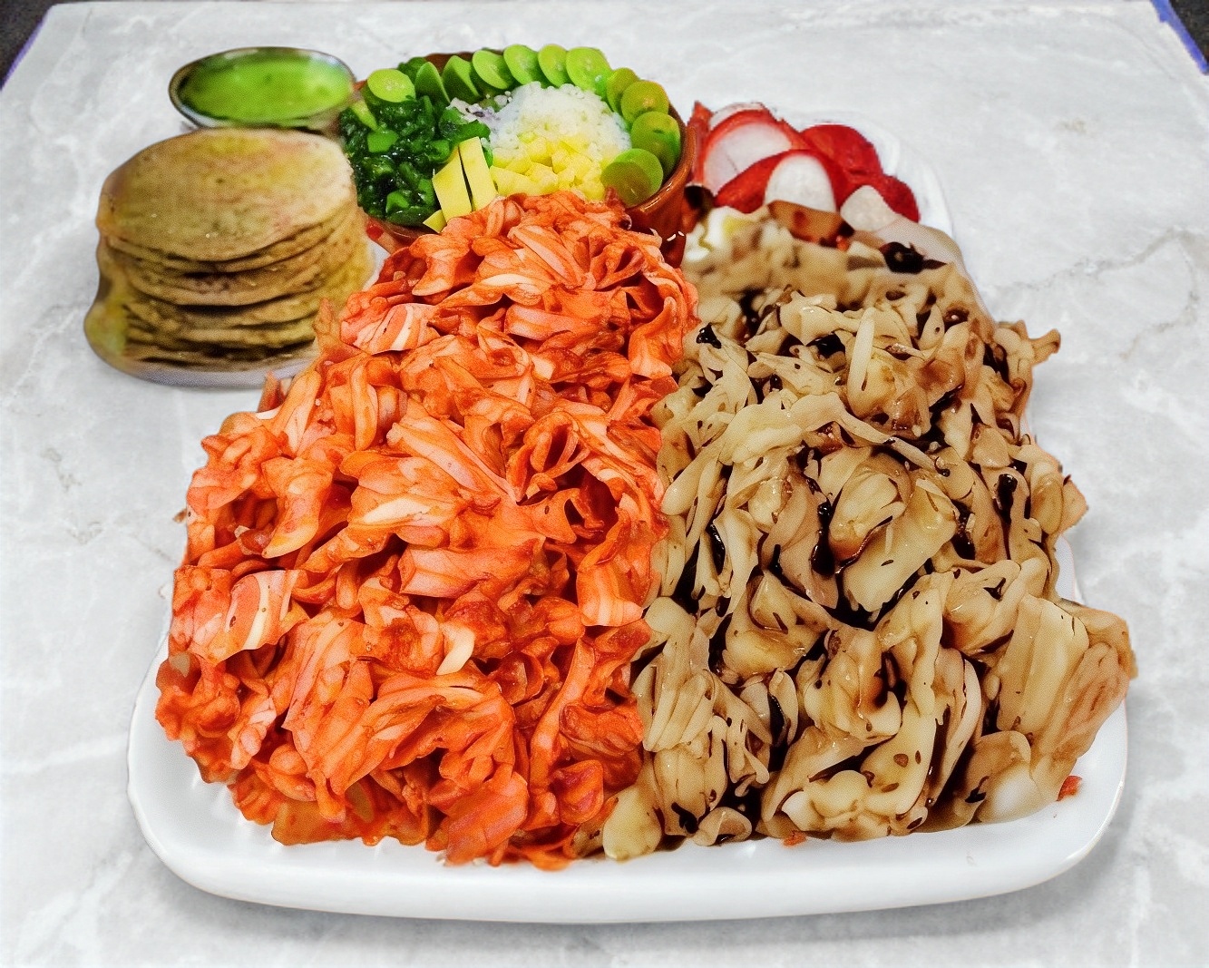 (Aprox.500 gr )10 tortillas maíz, 5 tortillas de harina, cebolla, cilantro,piña, limones y 3 salsas