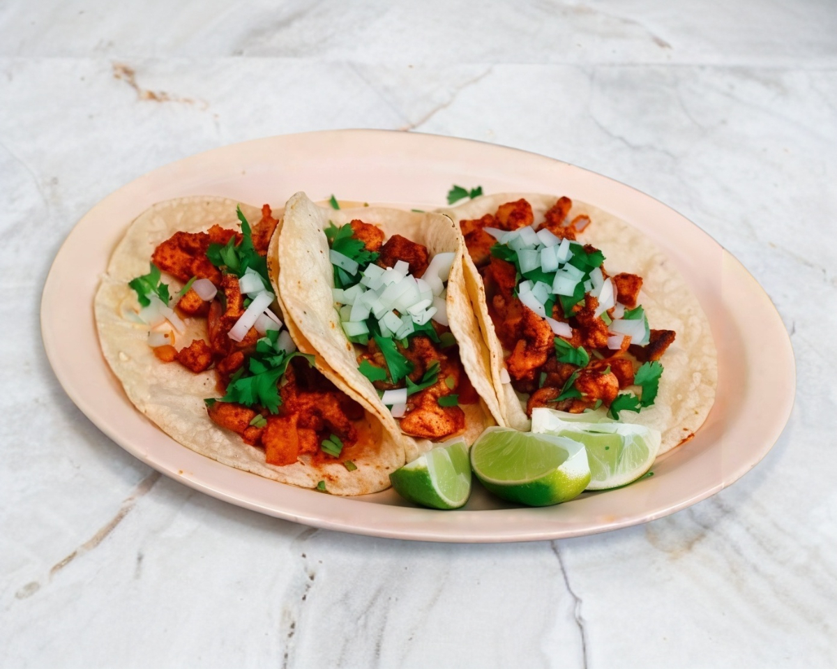 Pastor, morrón, cebolla, jamón, tocino, queso y tortillas.