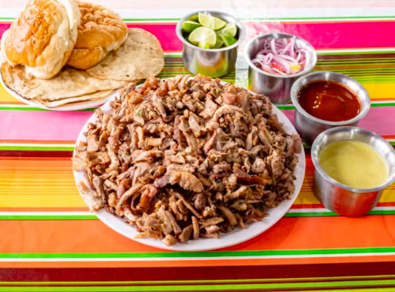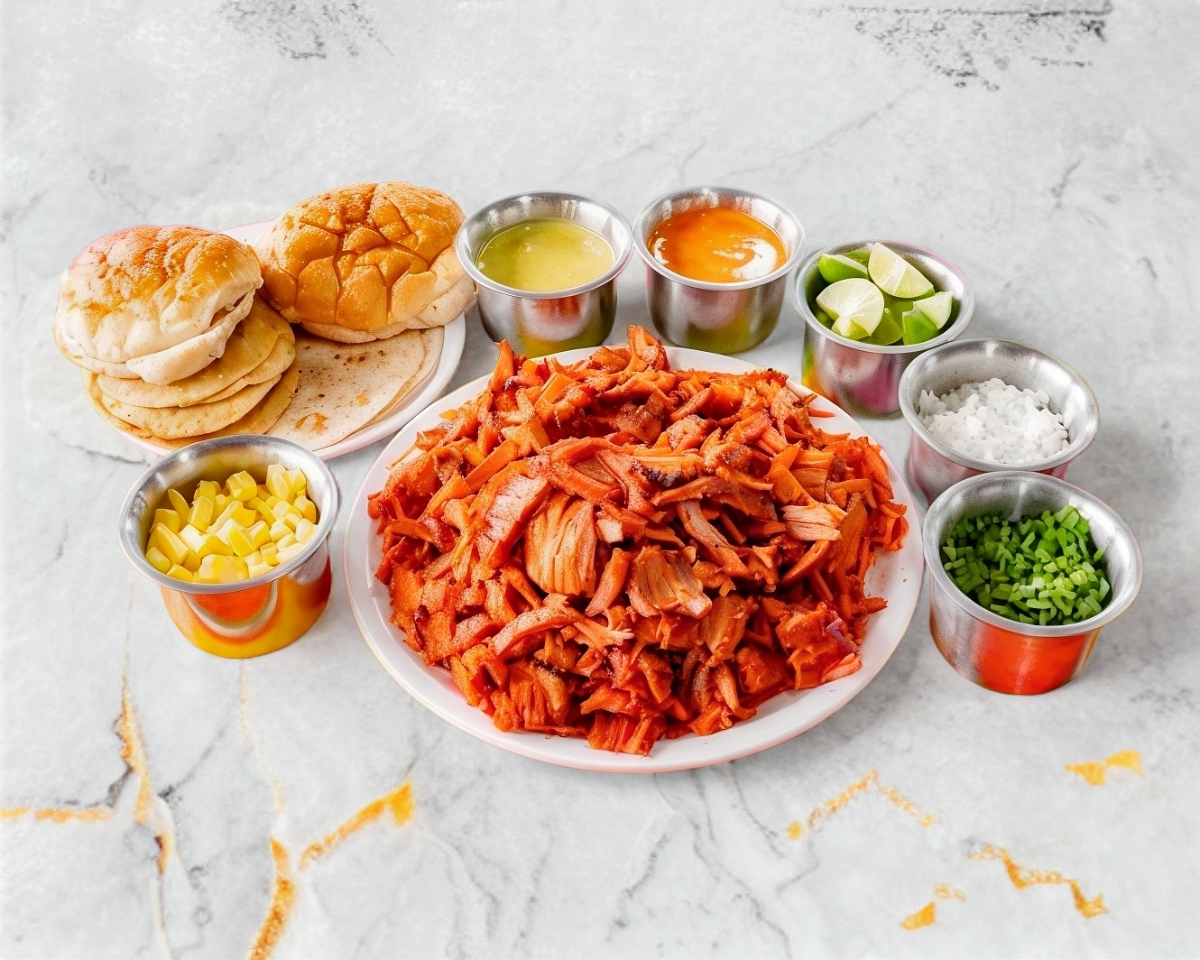 Pastor, chorizo, jamón, tocino, cebolla, queso y tortillas.