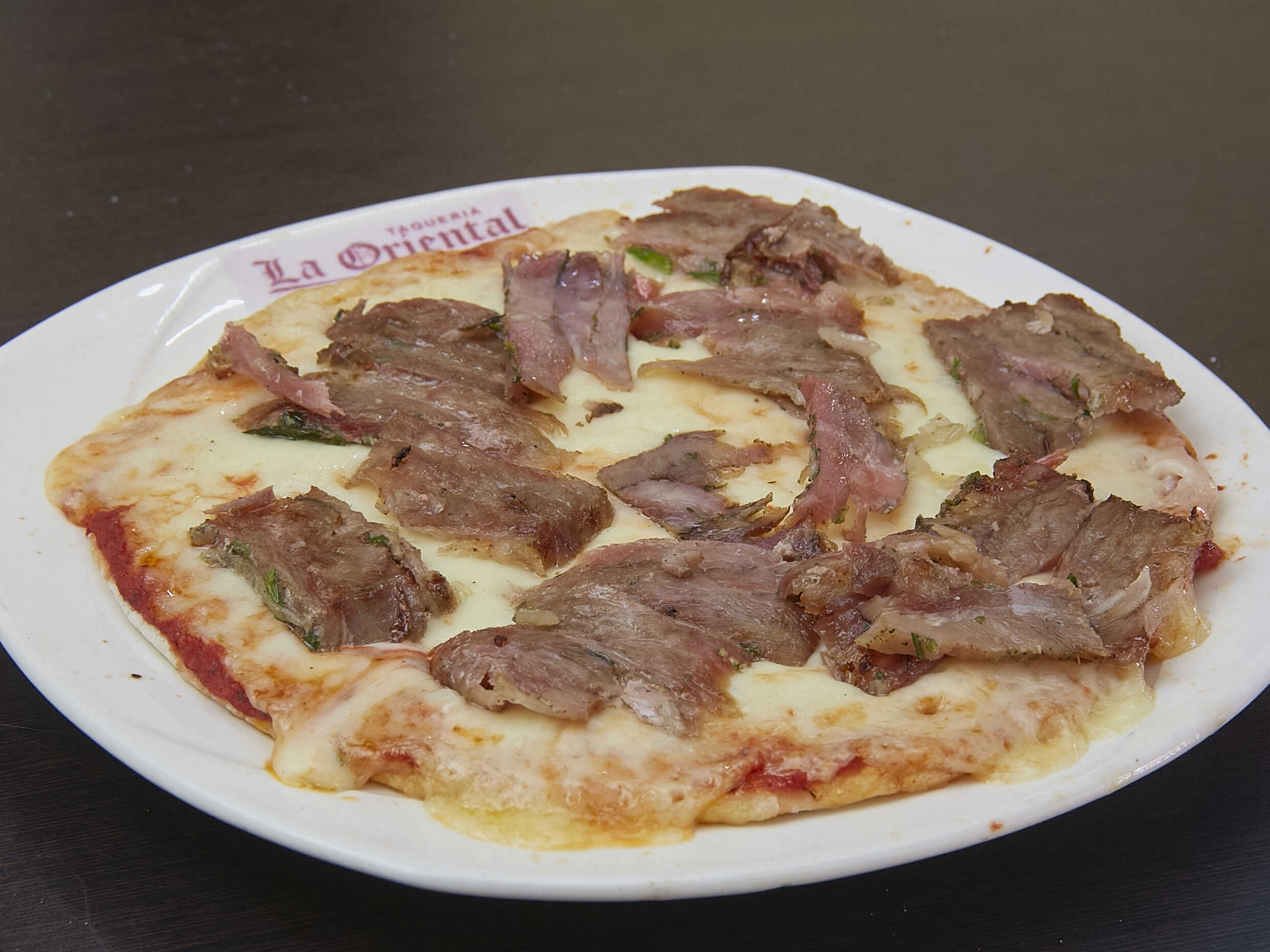 2 tortillas de harina con champiñones, queso gratinado y carne árabe.